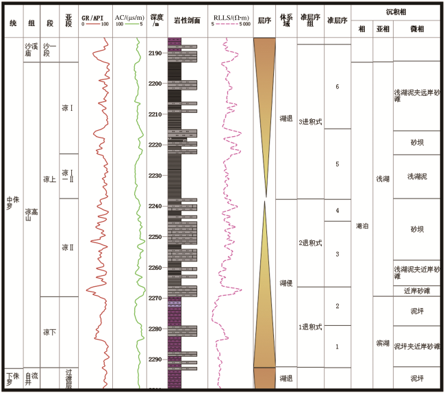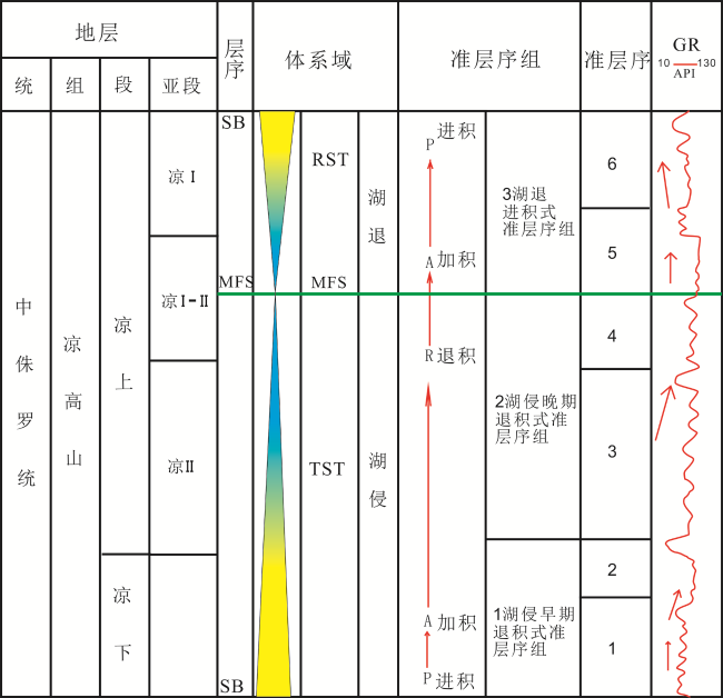 | 半深湖 | 半深湖泥 | 凉上Ⅰ―Ⅱ亚段、凉上Ⅰ亚段 | TST上部、RST下部 | 2退积式、3进积式 | 4、5 | |