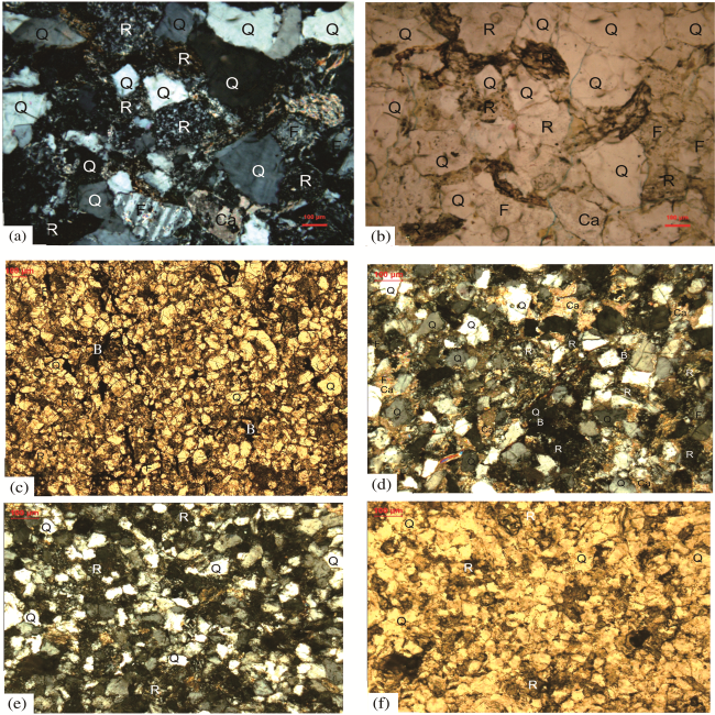 图16 滩坝相储集体岩石微观特征(a) Xn9井,1 855.18m,凉上Ⅱ,坝主体细粒岩屑长石砂岩,正交,×100;(b) Xn9井,1 855.18m,凉上Ⅱ,坝主体细粒岩屑长石砂岩,见构造缝和岩屑溶蚀孔,单偏,×100(与a同一视域);(c) G17井,2 464.36m,凉上Ⅰ,坝侧缘,粉—细粒岩屑质石英砂岩,分选中等,石英表面干净,溶蚀孔充填少量沥青,单偏,×10;(d) G17井,2 464.36m,凉上Ⅰ,坝侧缘,粉—细粒岩屑质石英砂岩,分选中等,正交,×40;(e) G21井,2 278m,凉上Ⅱ,远岸砂滩,粉—细粒岩屑质石英砂岩,正交,×100;(f) G21井,2 278m,凉上Ⅱ,远岸砂滩,粉—细粒岩屑质石英砂岩,颗粒次圆状,分选好,单偏,×100(与e同一视域);Q:石英,F:长石,R:岩屑,Ca:方解石,B:沥青 Fig.16 Microscopic characteristics of beach-bar reservoir |