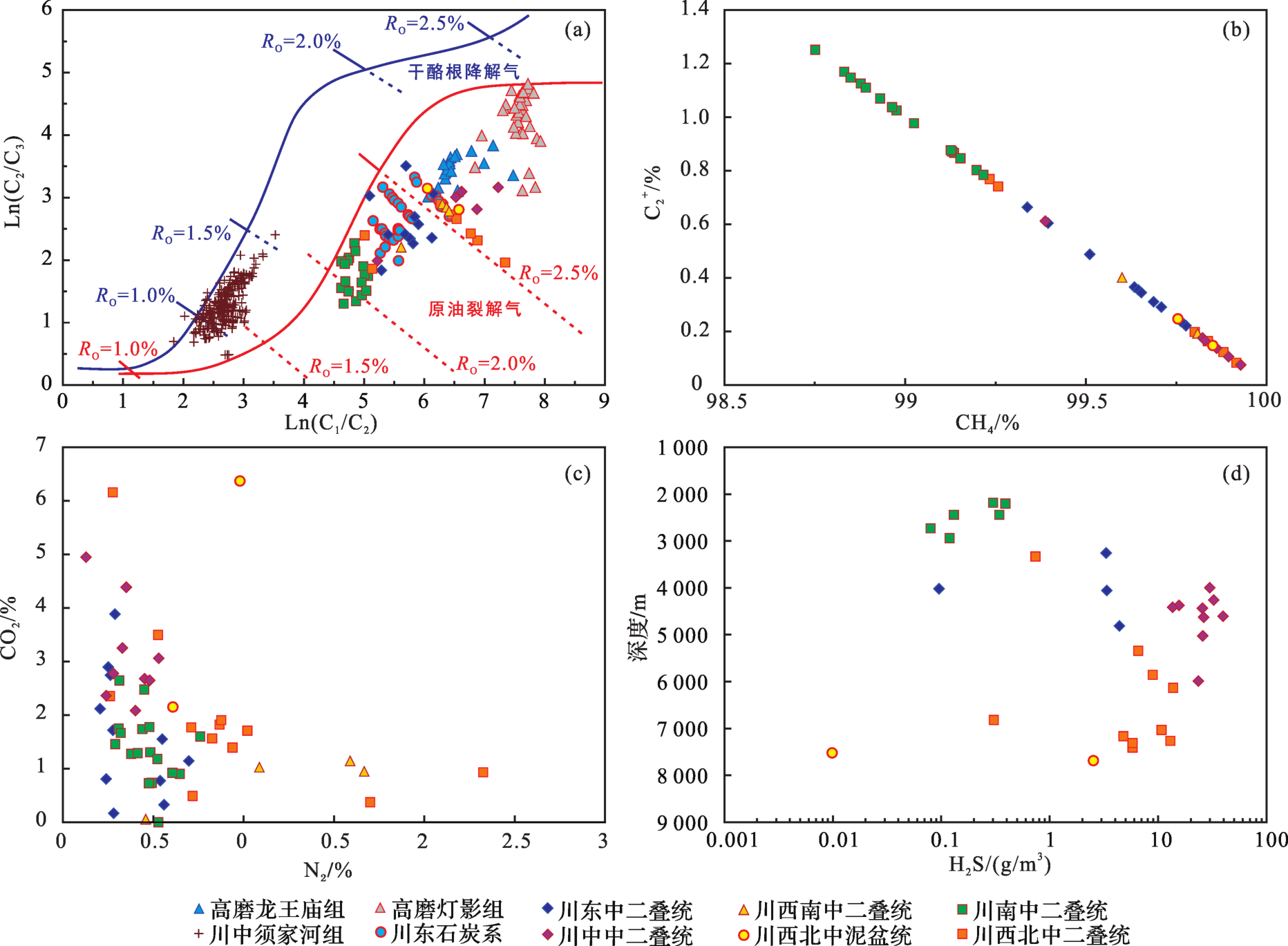 龙岗70 | 7 291 | 茅口组 | 92.49 | 0.07 | 0.01 | 6.15 | 0.28 | 0.02 | 0.10 | 0.90 | 12.84 | 0.999 3 | -29.5 | -27.9 | -136 | ||||