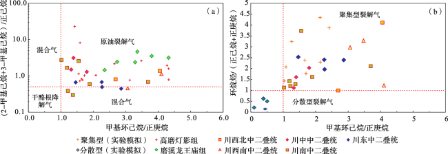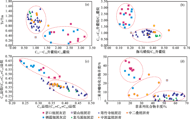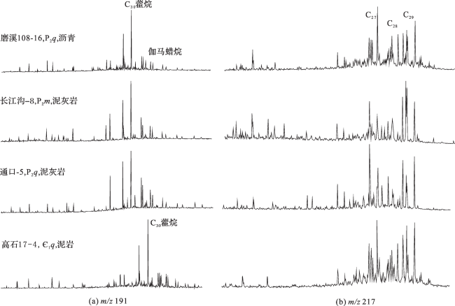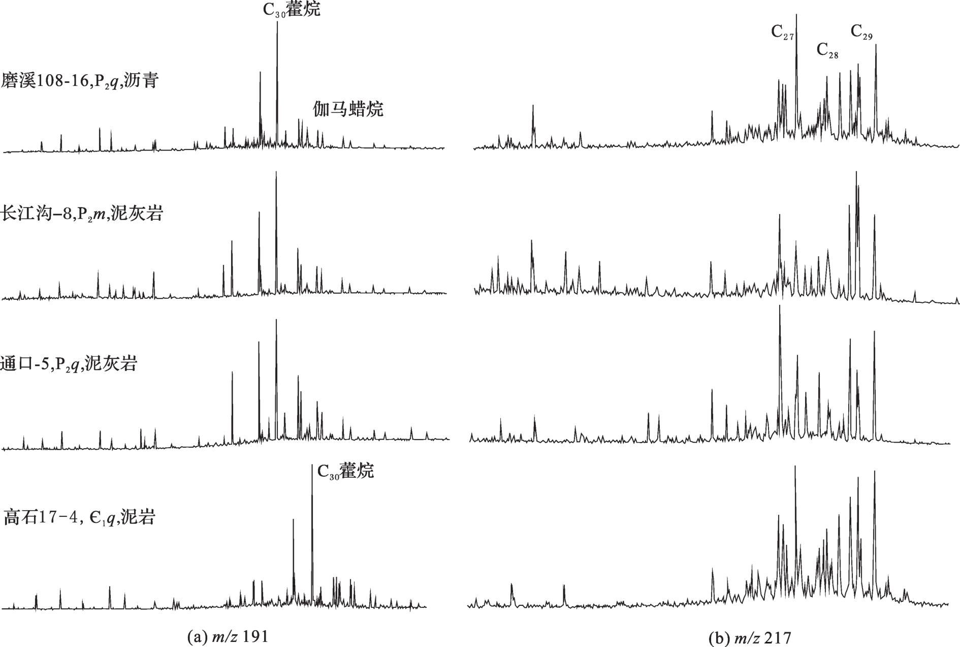 图7 四川盆地烃源岩与沥青甾烷、萜烷特征Fig.7 Characteristics of sterane and terpane of source rocks and bitumen in Sichuan Basin |