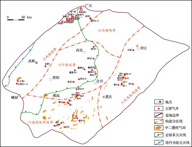 图 1 四川盆地中泥盆统和中二叠统气田与重点气井分布Fig.1 Distribution of Middle Devonian and Middle Permian gas fields and key gas wells in Sichuan Basin |