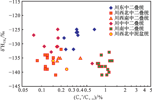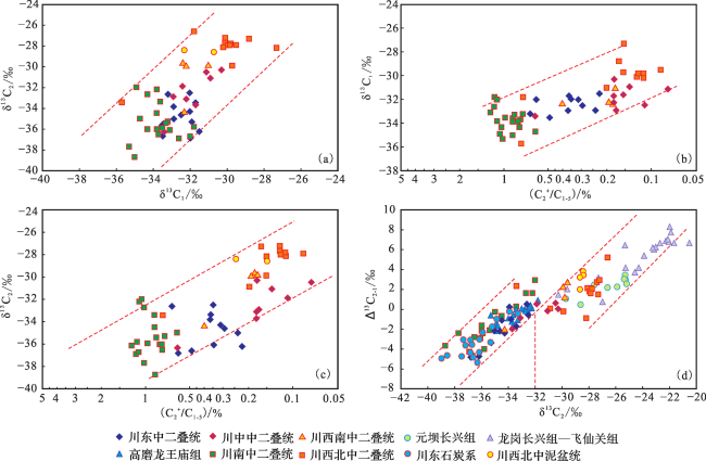 表1 四川盆地中泥盆统、中二叠统天然气组分及碳氢同位素数据(续表)Table 1 The gas components and carbon-hydrogen isotopic compositions of Middle Devonian and Middle Permian natural gas in Sichuan Basin(Continue) |
