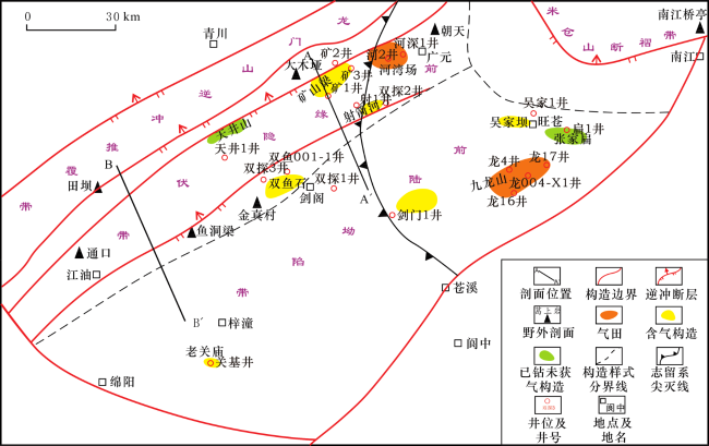 坳陷带 | ①龙潭组泥页岩厚度:37 m;②中下三叠统膏岩厚度:270 m | 茅口组,重碳酸钠型,矿化度16.89 g/L | 地层压力系数1.36 | 关基井,扁1,吴家1 |