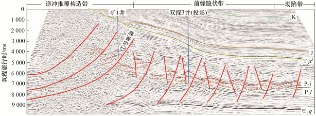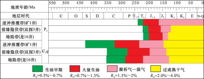 前缘隐伏带 | ①龙潭组泥页岩厚度:96 m;②中下三叠统膏岩厚度:310 m | ①茅口组水型:CaCl2,地层压力:82MPa;②栖霞组,氯化钙型,地层压力:73.5MPa。 | ①茅口组压力系数:1.2;②栖霞组地层压力系数:1.02 | 双探1, 双探3 |