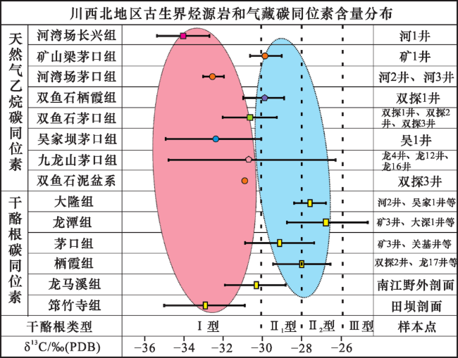 图7 川西北古生界烃源岩干酪根和乙烷碳同位素值对比(河湾场、吴家坝和矿山梁数据据黄东等[5],2011;其余数据据刘弈伶[28],2016)Fig.7 Carbon Isotope correlation of kerogen and ethane of Paleozoic source rocks in northwestern Sichuan Basin(data of Hewanchang, Wujiaba and Kuangshanliang according to HUANG et al.[5],2011; other data according to LIU et al.[28],2016). |