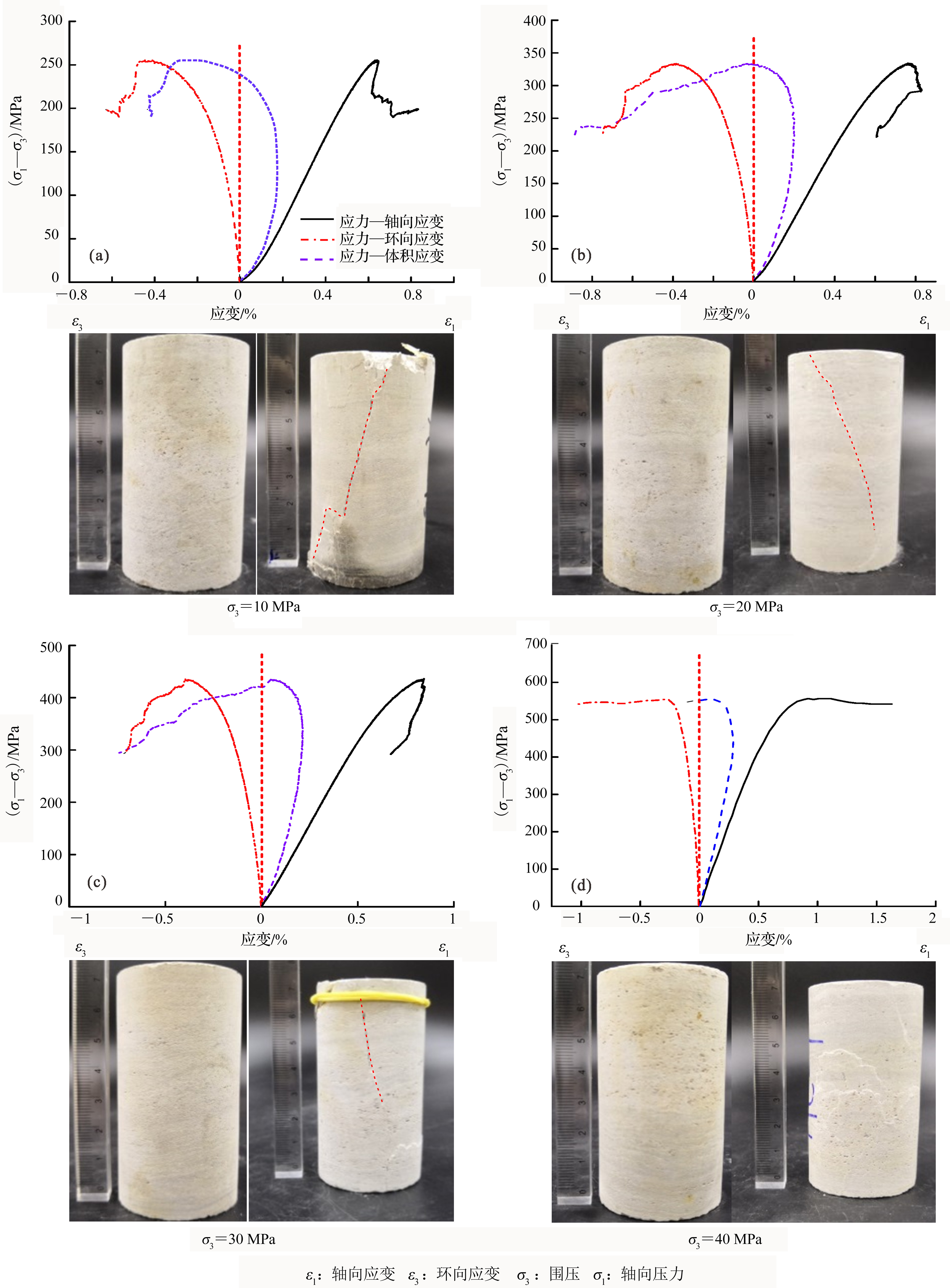 岩性 | 围压 /MPa | 峰值轴向应变 /% | 峰值应力 /MPa | 扩容应力 /MPa |