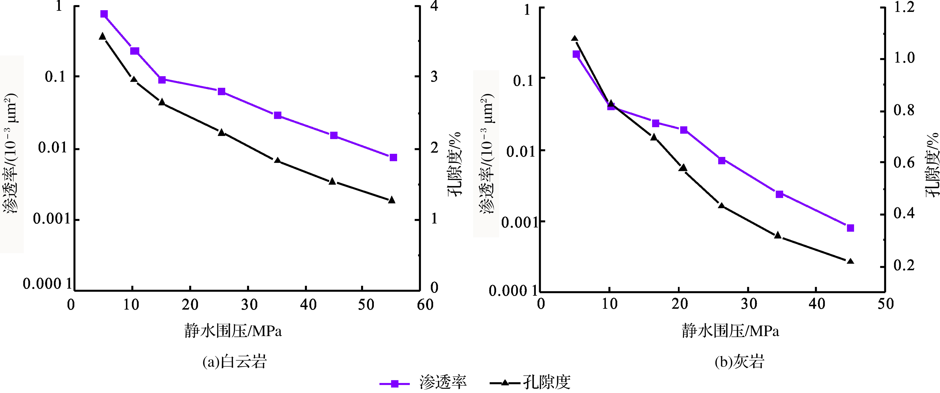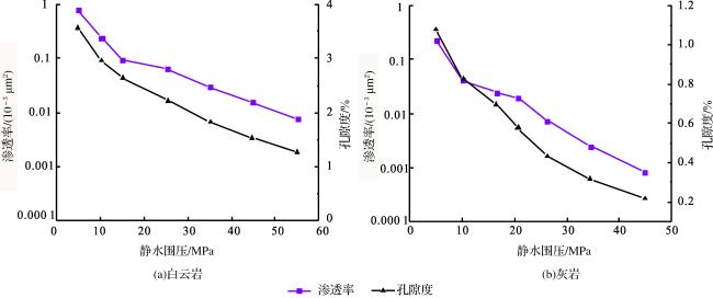 表3 白云岩、灰岩静水压力下渗透率及孔隙度Table 3 Permeability and porosity of dolomite and limestone under hydrostatic pressure |