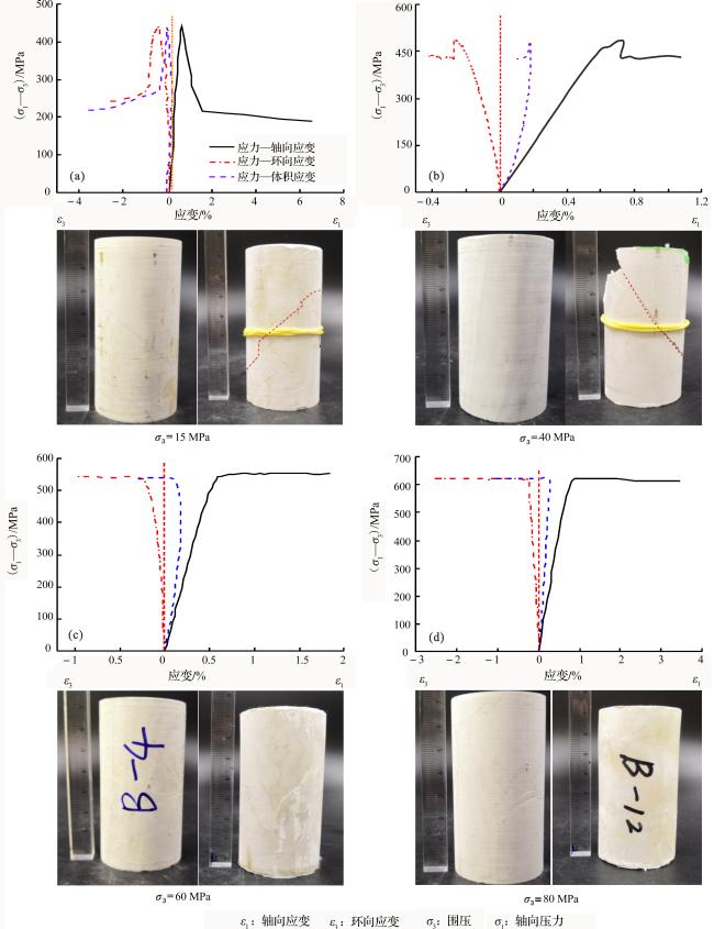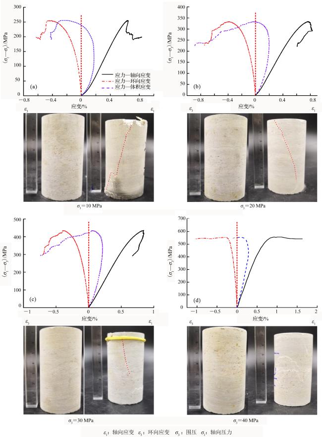 表2 不同围压条件下白云岩和灰岩变形曲线强度值Table 2 Strength values of dolomite and limestone deformation curves under different confining pressures |