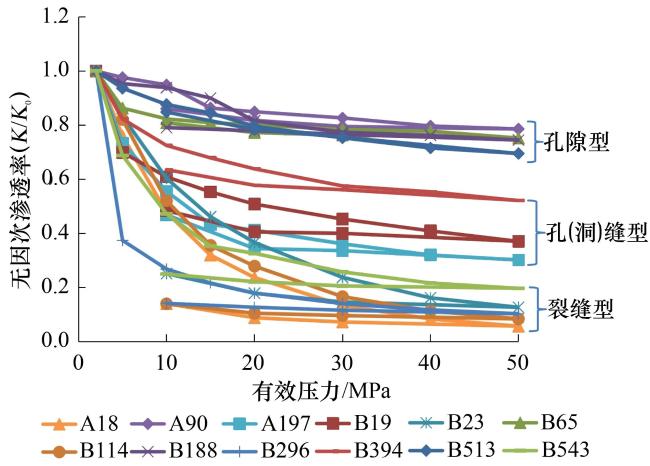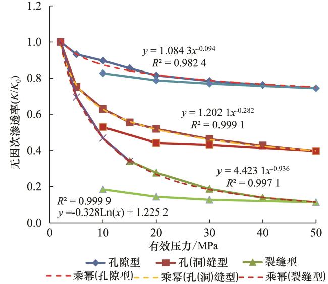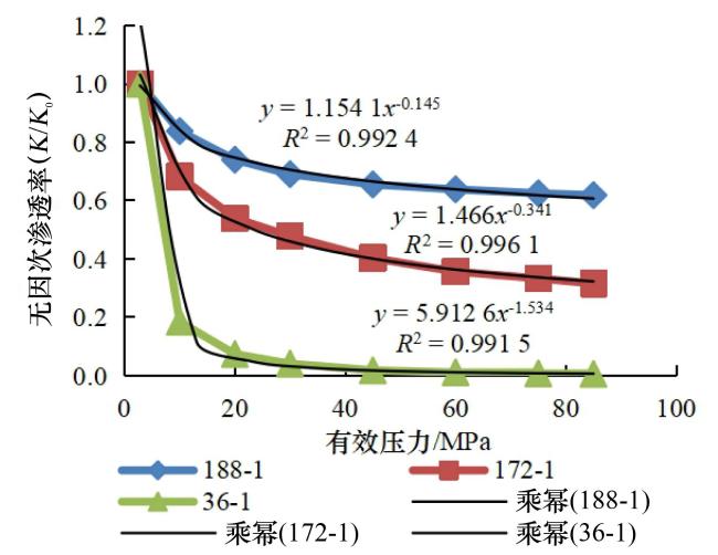 图6 超高压测试无因次渗透率与有效压力的关系Fig.6 Relationship between dimensionless permeability and effective pressure in ultra-high pressure test |