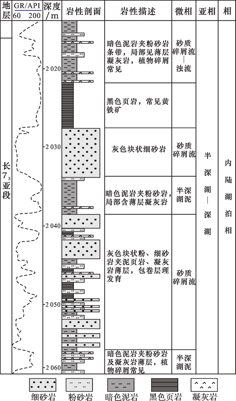 | 岩性 | 细砂岩 | 粉砂岩 | 黑色页岩 | 暗色泥岩 | 凝灰岩 |