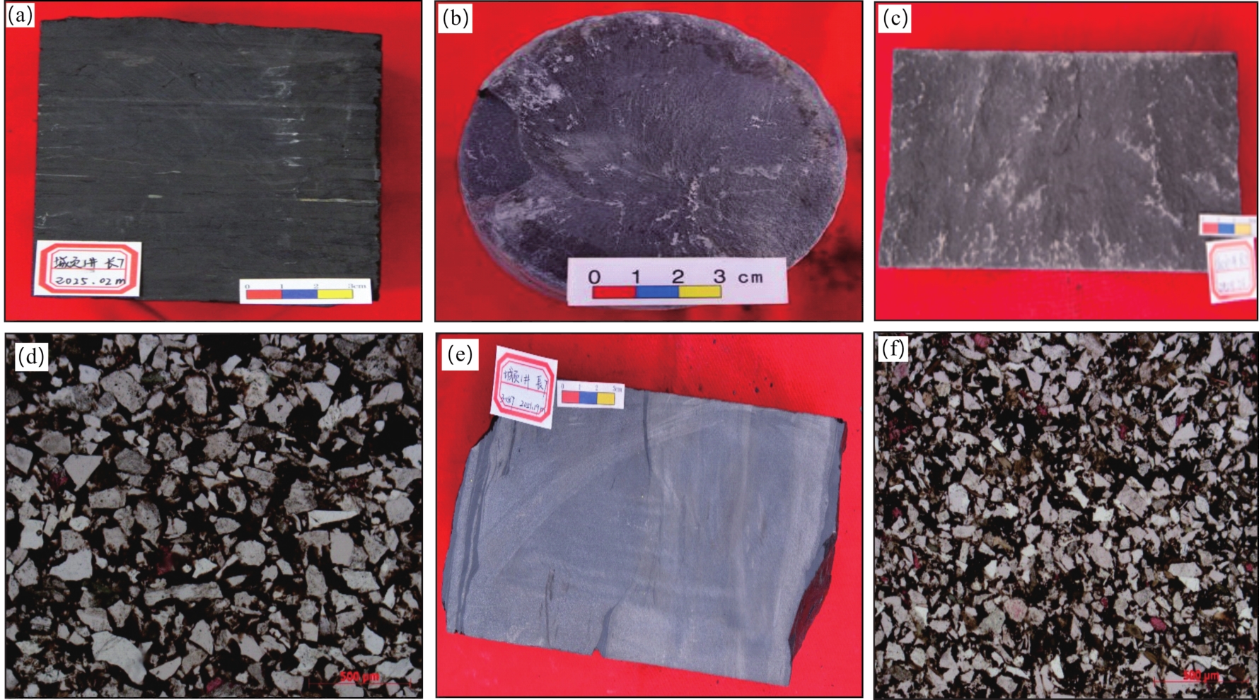 图4 鄂尔多斯盆地长73亚段不同类型岩石岩心及薄片特征(a)城页1井,2 025.02 m,长73亚段,黑色页岩;(b)阳检1井,2 060.85 m,长73亚段,暗色泥岩;(c)城页1井,2 030.39,长73亚段,细砂岩;(d)城页1井,2 028.70 m,长73亚段,细砂岩特征,单偏光;(e)城页1井,2 054.65,长73亚段,粉砂岩;(f)城页1井,2 050.31 m,长73亚段,粉砂岩薄片特征,单偏光 Fig.4 Characteristics of different types of rock cores and thin slices of the Chang 73 sub-member, Ordos Basin |