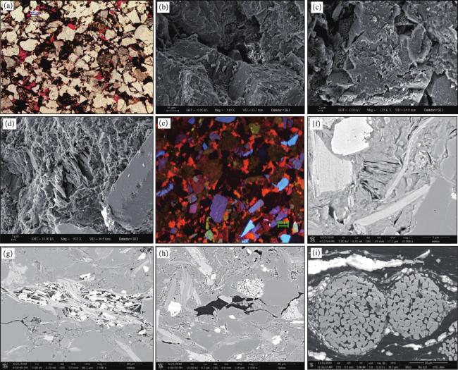 图7 鄂尔多斯盆地长73亚段泥页岩层系不同类型岩石储集空间特征(a)城96井,2 071.30 m,长73亚段,刚性颗粒支撑的残余粒间孔;(b)城页1井,2 027.56 m,长73亚段,粒间孔;(c)城页1井,2 050.71 m,长73亚段,长石溶孔;(d)城页1井,2 052.85 m,长73亚段,粒间溶孔;(e)城页1井,2 028.14 m,长73亚段,阴极发光,砂质岩中强烈的钙质胶结;(f)—(g)阳检1井,长73亚段,黏土矿物晶间孔;(h)阳检1井,长73亚段,粒间孔,晶间孔;(i)白522井,1 951.36 m,长73亚段,黄铁矿晶间孔 Fig.7 Characteristics of reservoir space of different types in the Chang 73 sub-member, Ordos Basin |