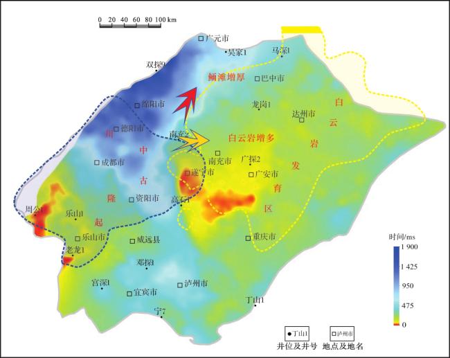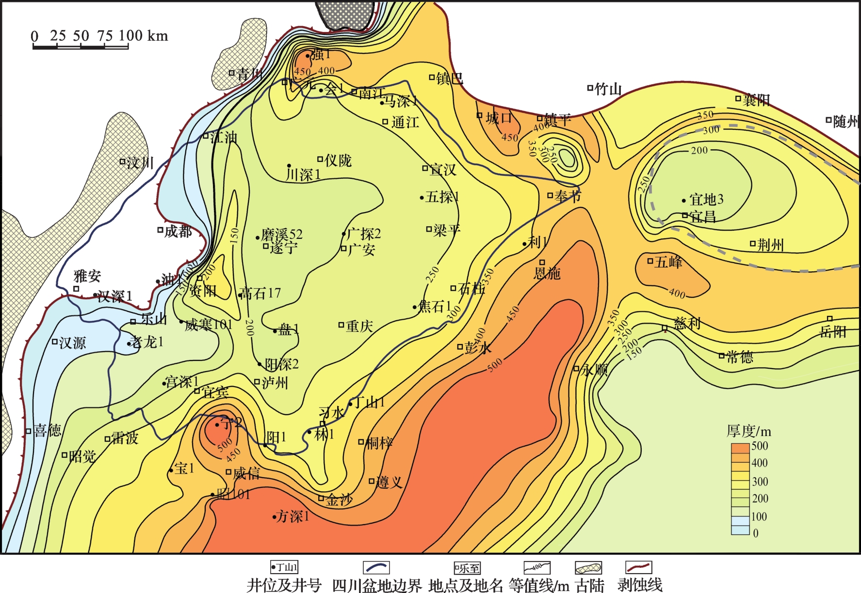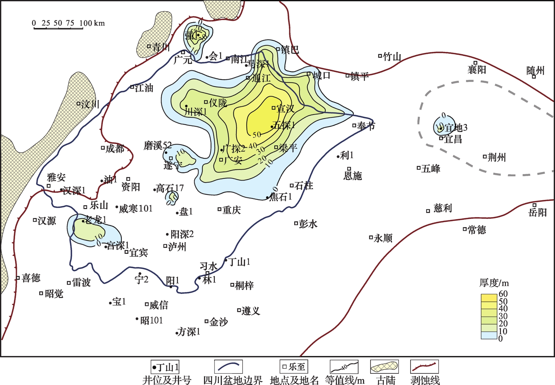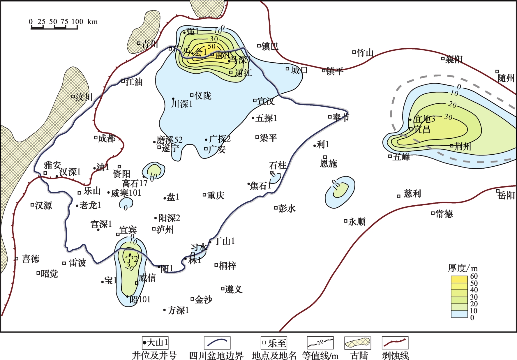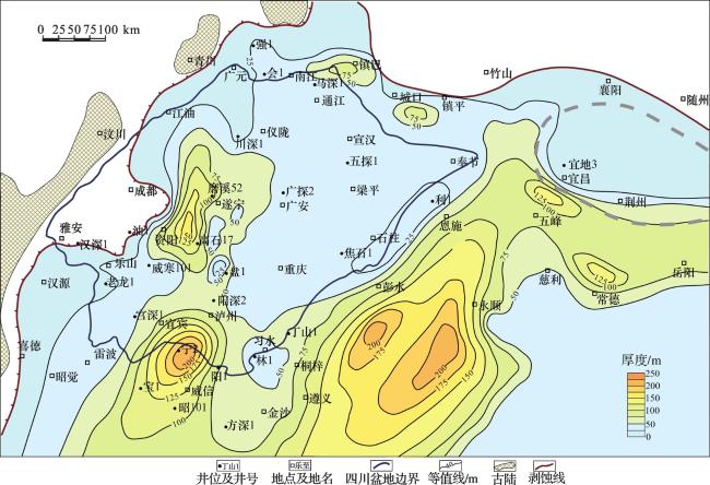 图7 四川盆地及其周缘沧浪铺组下段鲕粒灰岩厚度等值线Fig.7 Thickness contour map of olitic limestone of lower Canglangpu Formation for Sichuan Basin and its periphery |