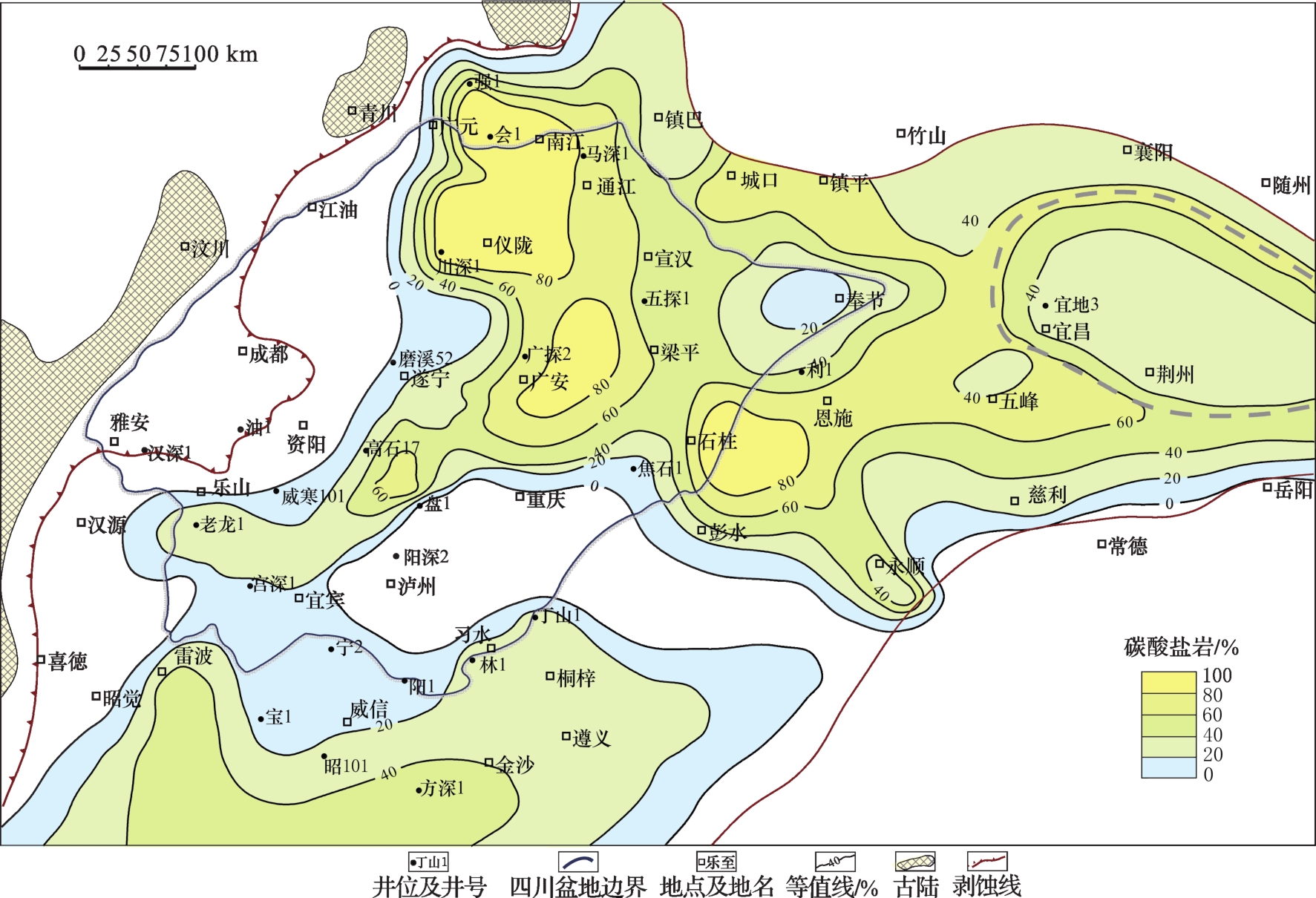 图6 四川盆地及其周缘地区沧浪铺组下段碳酸盐岩含量等值线Fig.6 Contour map of carbonate rocks content of Lower Canglangpu Formation for Sichuan Basin and its periphery |