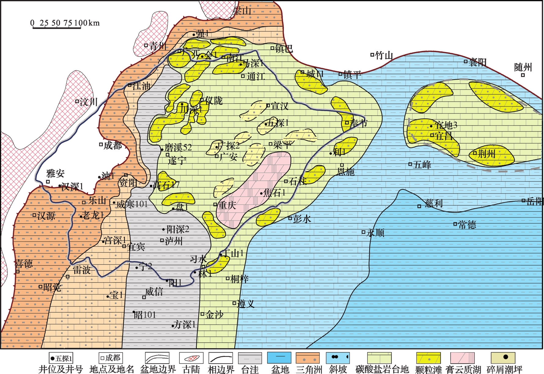 | 岩相单因素 | 三角洲相 | 碎屑潮坪相 | 台洼 | 碳酸盐岩台地 | 斜坡 | 盆地 |