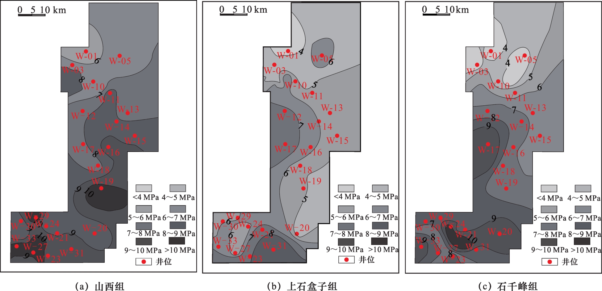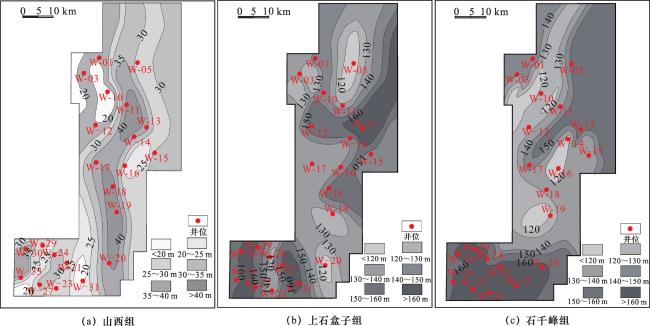 单井突破压力曲线和突破压力平面分布图显示,不同层突破压力差异明显。山西组突破压力最高,石千峰组次之,上石盒子组最低(