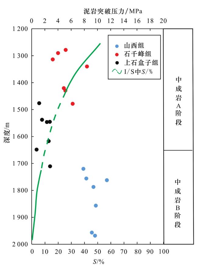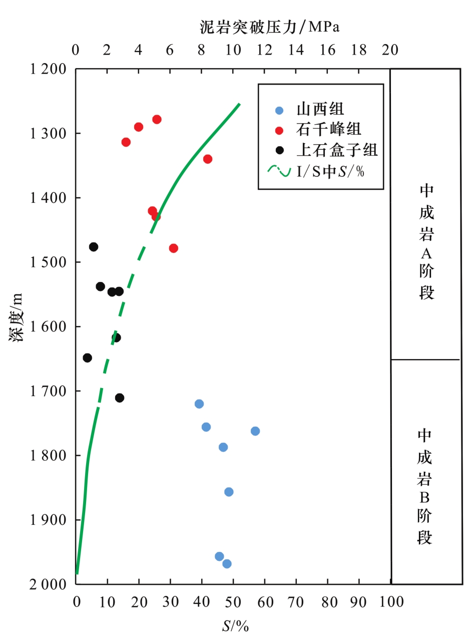 图7],使得泥岩渗透率急剧降低,泥岩盖层进一步致密。因此山西组泥岩突破压力更大,在7.86~11.43 MPa之间(