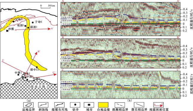 | 台地边缘 | 台缘、礁后滩 | 砂屑白云岩、藻黏结白云岩 | 轮南—塔中32井,塔深1井 | |