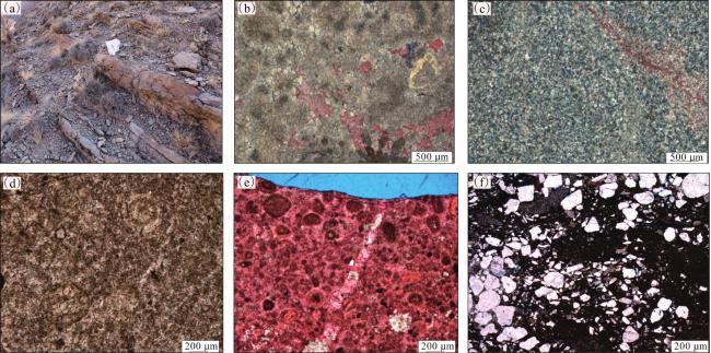 图7 塔里木盆地下寒武统吾松格尔组典型露头和薄片照片(a)薄层中低能滩体与泥粉晶白云岩互层,局限—半局限台地潮坪亚相,夏特剖面;(b)亮晶颗粒白云岩,颗粒滩亚相,夏特剖面, 铸体薄片;(c)泥粉晶白云岩,泥云坪亚相,夏特剖面,铸体;(d)含鲕粒藻砂屑白云岩,礁后滩亚相,轮探1井,8 205 m,岩屑,普通薄片;(e)含鲕粒藻砂屑灰岩,礁后滩亚相,轮探1井,8 258 m,岩屑,铸体薄片;(f)含陆源碎屑泥粉晶白云岩,混积潮坪亚相,中寒1井,7 368.2 m,岩屑,普通薄片 Fig.7 Typical photos of outcrop and thin sections from Lower Cambrian Wusonger Formation, Tarim Basin |
