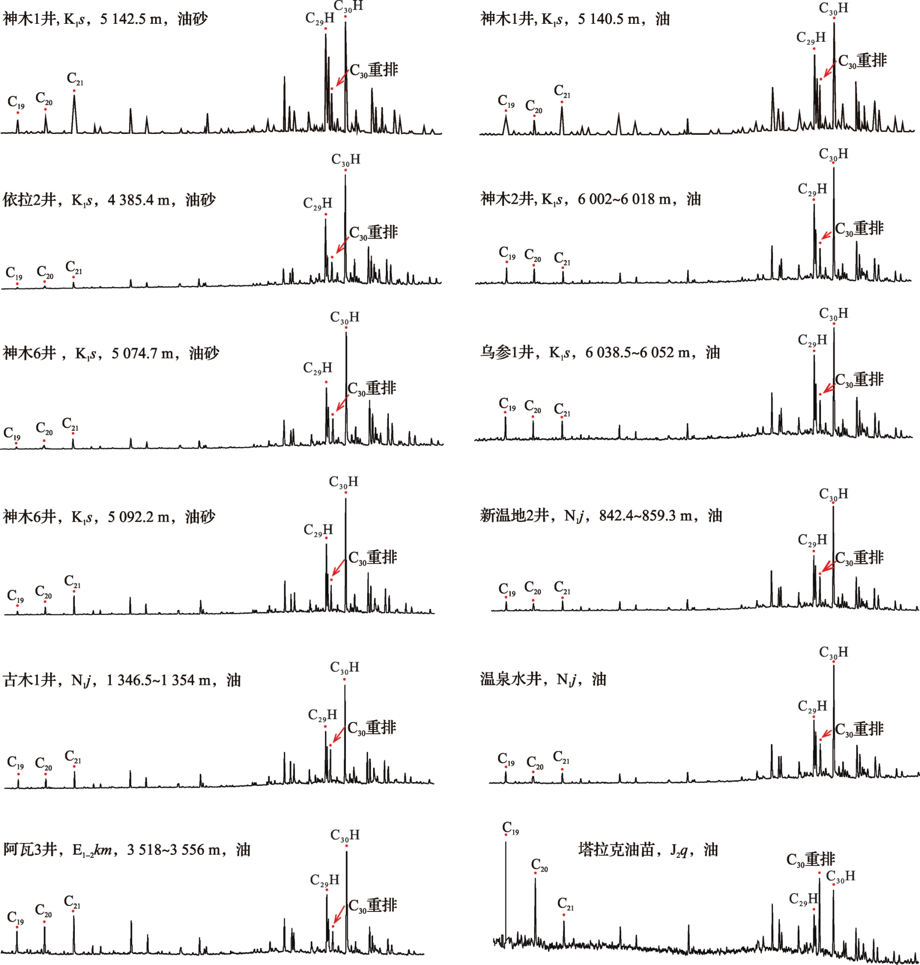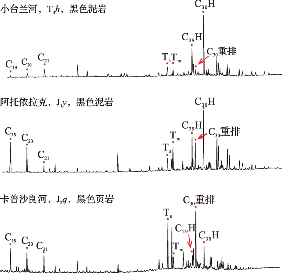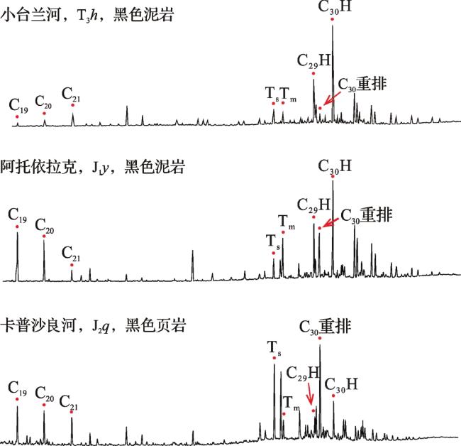 图3 库车坳陷西部典型烃源岩萜烷类生物标志化合物特征Fig.3 Characteristics of terpene biomarkers from typical source rocks in western Kuqa Depression |