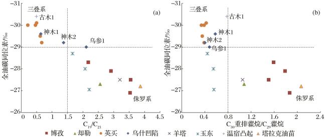 图5 库车坳陷西部乌什—英买地区原油生物标志化合物参数与全油碳同位素关系(a)原油三环萜烷C19/C21与全油碳同位素关系 (b)原油C30重排藿烷/C29藿烷与全油碳同位素关系 Fig.5 Relationship between crude oil biomarker parameters and total oil carbon isotopes in Wushi-Yingmai area, western Kuqa Depression |