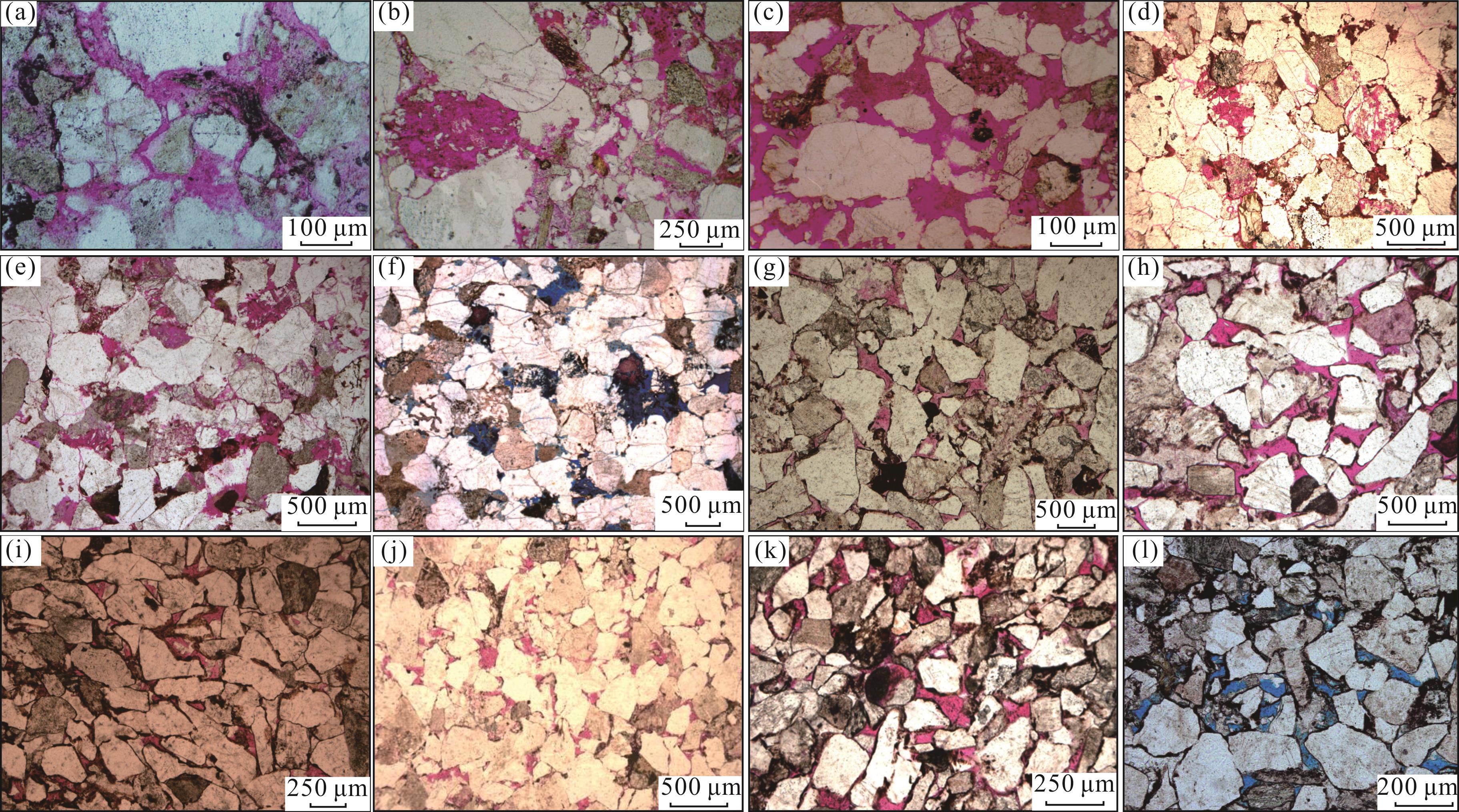 图6 库车坳陷北部构造带侏罗系阿合组与克拉苏构造带白垩系巴什基奇克组储层储集空间类型(a)依南2井,4 843.0 m,J1 a,粒间溶孔、粒内溶孔及微孔隙,面孔率9%;(b)依南4井,4 375.5 m,J1 a,粒内溶孔、粒间溶孔及微孔隙,面孔率8%;(c)明南1井,971.0 m,J1 a,粒间溶孔及粒内溶孔,面孔率16%;(d)迪北102井,5 091.1 m,J1 a,粒内溶孔及微孔隙、面孔率3%;(e)吐孜4井,4 206.9 m,J1 a,粒间溶孔、粒内溶孔及微孔隙,面孔率8%;(f)迪北105X井,4 764.9 m,J1 a,粒间溶孔、粒内溶孔、微孔隙及微裂缝,面孔率7%;(g)克深501井,6 421.9 m,K1 bs,原生粒间孔及粒内溶孔,面孔率5%;(h)克深601井,6 084.5 m,K1 bs,原生粒间孔,面孔率7%;(i)克深2-1-5井,6 734.1 m,K1 bs,原生粒间孔及粒内溶孔,面孔率3%;(j)克深8井,6 731.4 m,K1 bs,原生粒间孔及粒内溶孔,面孔率4%;(k)大北207井,5 783.9 m,K1 bs,原生粒间孔及粒内溶孔,面孔率8%;(l)博孜104井,6 846.1 m,K1 bs,原生粒间孔及粒内溶孔,面孔率6% Fig.6 Reservoir space types of J1 a in the northern tectonic belt and K1 bs in the Kelasu tectonic belt of Kuqa Depression |