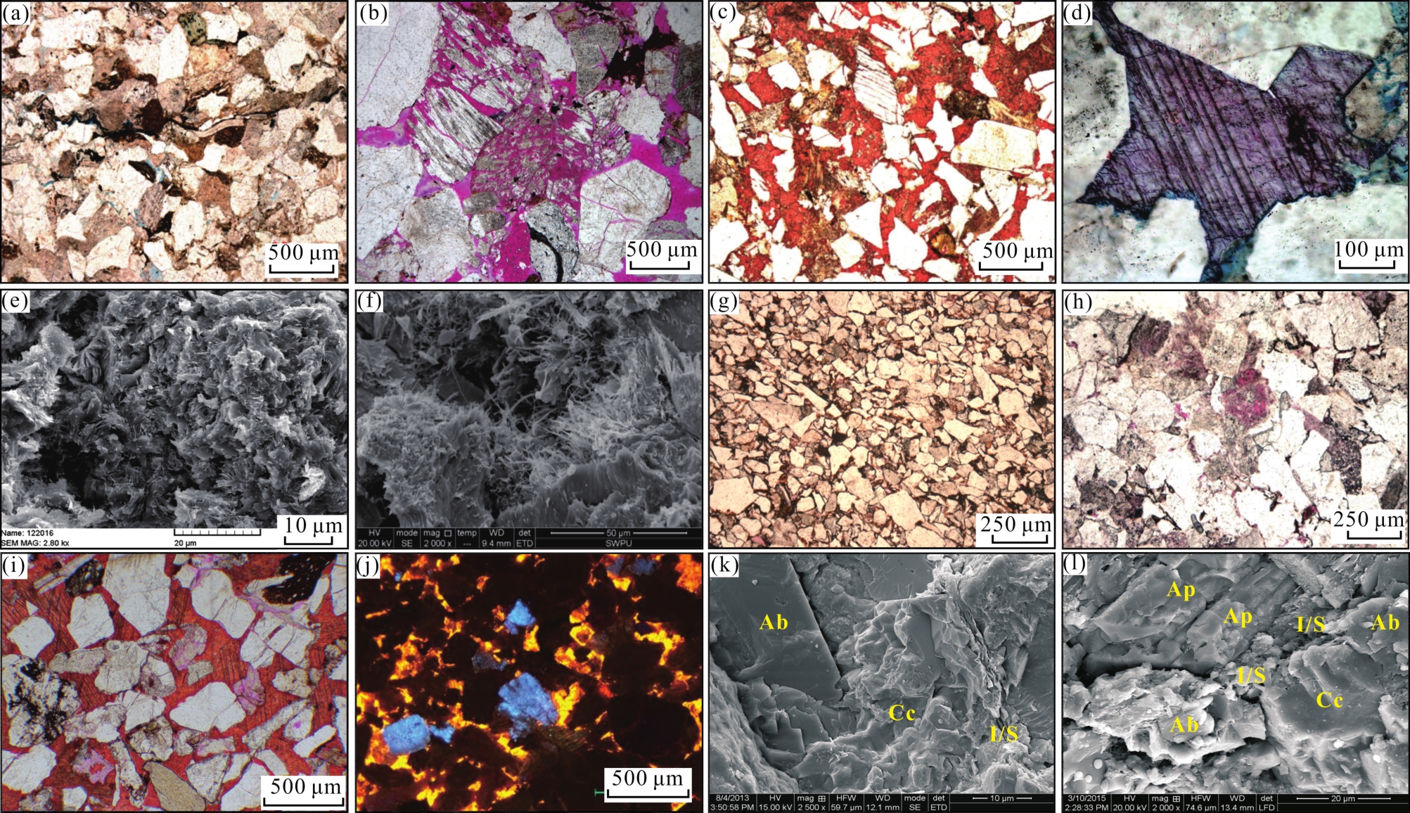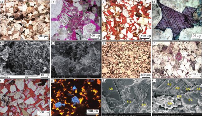 图9 库车坳陷北部构造带侏罗系阿合组与克拉苏构造带白垩系巴什基奇克组成岩作用(a)迪北105X井,4 762.1 m,J1 a,颗粒压实致密,可见压弯的片状云母;(b)吐孜4井,4 204.9 m,J1 a,粒间溶蚀及长石粒内溶蚀;(c)吐格4井,3 850.1 m,J1 a,粒间方解石染成橘红色;(d)依南2井,4 787.0 m,J1 a,粒间铁方解石染成淡紫色;(e)克孜1井,4 835.3 m,J1 a,粒间伊/蒙混层、伊利石,可见高岭石的伊利石化;(f)迪北102井,5 030.9 m,J1 a,粒间毛发状伊利石;(g)克深207井,6 877.3 m,K1 bs,颗粒压实致密,未见明显孔隙;(h)大北205井,5 833.4 m,K1 bs,粒间溶蚀及长石粒内溶蚀;(i)克深501井,6 361.9 m,K1 bs,粒间方解石染成橘红色;(j)大北203井,6 350.9 m,K1 bs,阴极发光,粒间方解石呈橘黄色;(k)克深501井,6 354.2 m,K1 bs,粒间钠长石(Ab)、方解石(Cc)及伊/蒙混层(I/S);(l)克深902井,7 973.3 m,K1 bs,粒间钠长石(Ab)、磷灰石(Ap)、方解石(Cc)及伊/蒙混层(I/S) Fig.9 Diagenesis of J1 a in the northern tectonic belt and K1 bs in the Kelasu tectonic belt of Kuqa Depression |
