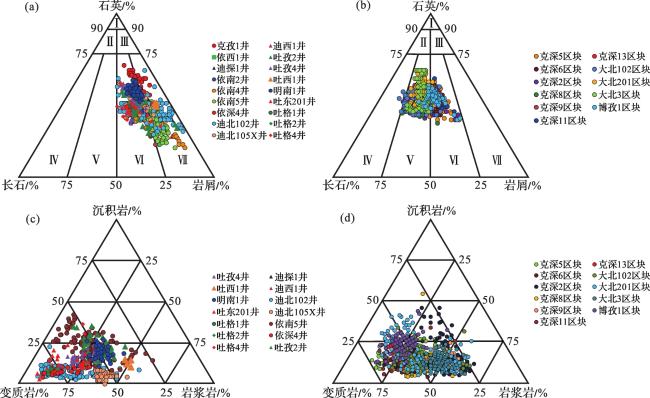 图5 库车坳陷北部构造带阿合组与克拉苏构造带巴什基奇克组储层岩矿组分三角图(a)阿合组岩石组分;(b)巴什基奇克组岩石组分;(c)阿合组岩屑组分;(d)巴什基奇克组岩屑组分Ⅰ:石英砂岩;Ⅱ:长石石英砂岩;Ⅲ:岩屑石英砂岩;Ⅳ:长石砂岩;Ⅴ:岩屑长石砂岩;Ⅵ:长石岩屑砂岩;Ⅶ:岩屑砂岩 Fig.5 Rock components of J1 a in the northern tectonic belt and K1 bs in the Kelasu tectonic belt of Kuqa Depression |