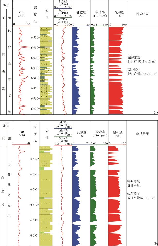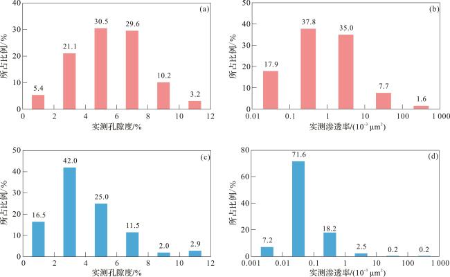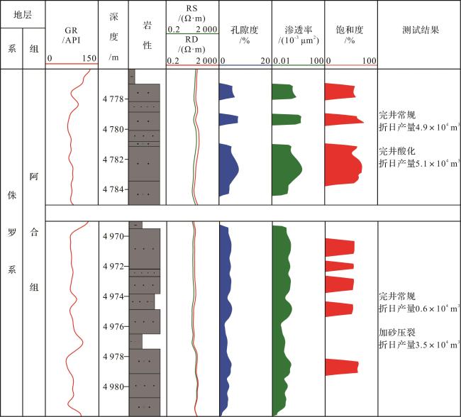 储层物性 | 实测孔隙度2.4%~18.4%,平均7.2%,渗透率 (0.02~120.75)×10-3 μm2,中值0.91×10-3 μm2 | 实测孔隙度2.0%~12.6%,平均4.3%,渗透率 (0.01~131.00)×10-3 μm2,中值0.05×10-3 μm2 | |
