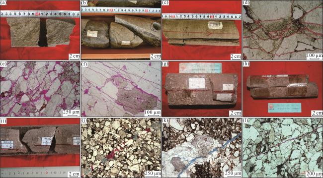 图8 库车坳陷北部构造带侏罗系阿合组与克拉苏构造带白垩系巴什基奇克组储层裂缝特征(a)依南2井,4 966.1 m,J1 a,细砂岩,直立的剪切缝,白云石少量充填;(b) 克孜1井,3 254.4 m,J1 a,中—粗砂岩,高角度剪切缝,未充填;(c)吐孜4井,4 209.6 m,J1 a,中砂岩,直立剪切缝,未充填;(d)依南2C井,4 751.4 m,J1 a,一组穿粒缝;(e)依南4井,4 416.9 m,J1 a,微裂缝网络连通孔隙;(f)依南5井,4 937.8 m,J1 a,粒缘缝及穿粒缝;(g)克深504井,6 658.9 m,K1 bs,细砂岩,直立张性缝,方解石半充填;(h)大北205井,5 836.0 m,K1 bs,细砂岩,直立剪切缝,未充填;(i) 博孜104井,6 843.1 m,K1 bs,中砂岩,直立剪切缝,未充填;(j)克深2-2-3井,6 944.9 m,K1 bs,穿粒缝,硅质及铁白云石充填;(k)克深905井,7 479.8 m,K1 bs,穿粒缝;(l)大北204井,5 986.5 m,K1 bs,穿粒缝 Fig.8 Reservoir fractures feature of J1 a in the northern tectonic belt and K1 bs in the Kelasu tectonic belt of Kuqa Depression |