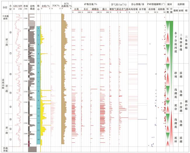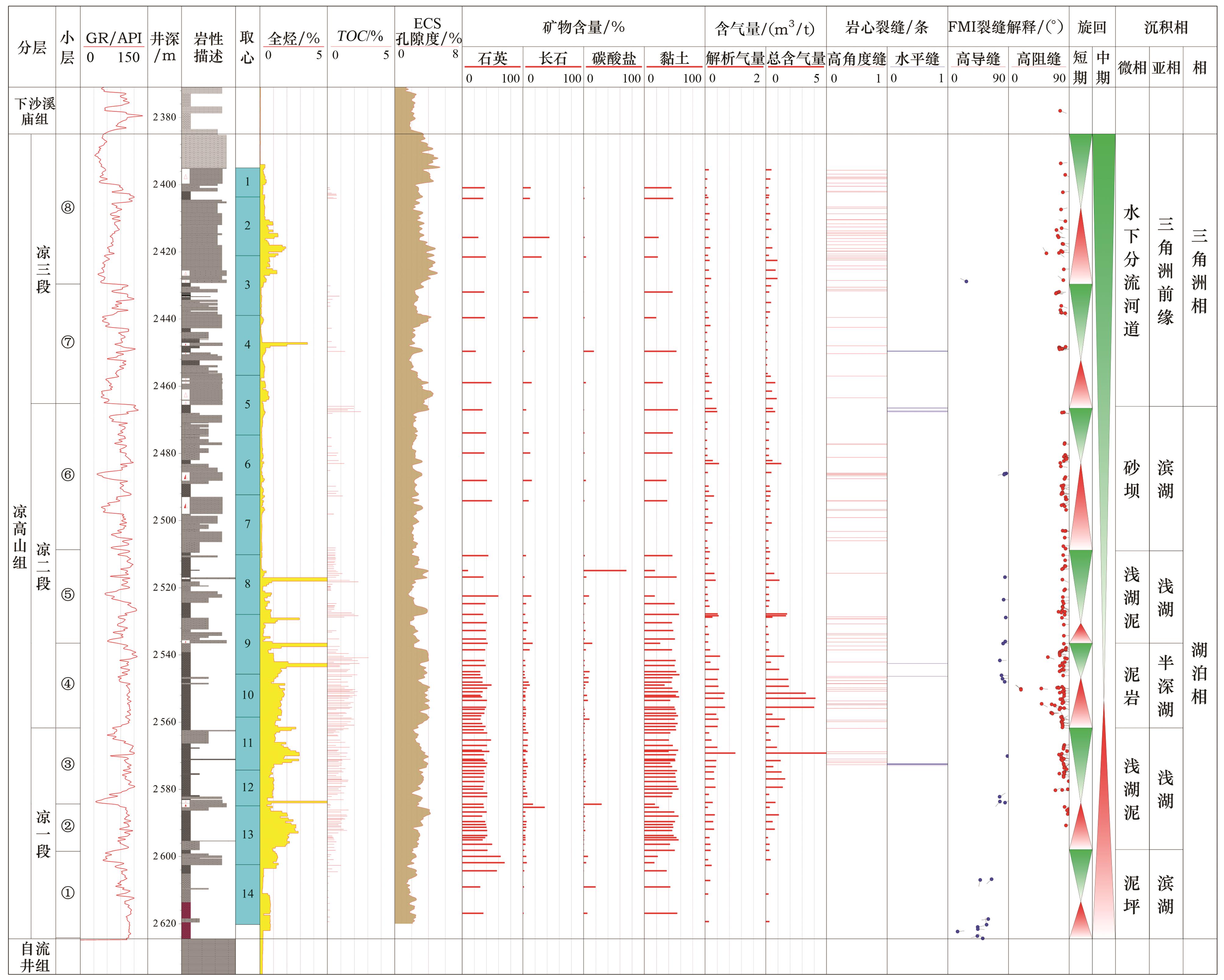 | 相带 | 深度/m | 小层 | 厚度/m | 泥岩厚度/m | 泥地比/% | GR/API | TOC/% | 含气量/(m3/t) |