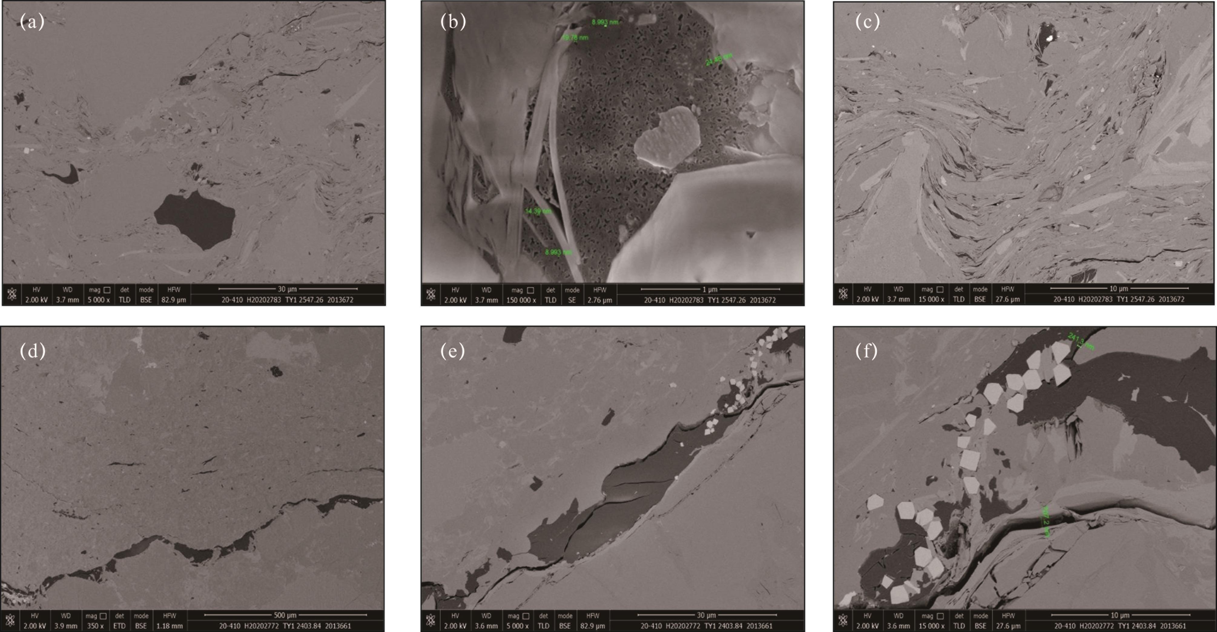 图4 TY1井凉高山组页岩储集空间类型(a)炭质泥岩(全貌),TY1井,2 547.26 m,凉高山组; (b)有机质孔(局部放大),TY1井,2 547.26 m,凉高山组;(c) 黏土矿物孔(局部放大),TY1井,2 547.26 m,凉高山组;(d) 炭质泥岩(全貌),TY1井,2 403.84 m,凉高山组;(e) 粒缘缝,TY1井,2 403.84 m,凉高山组;(f) 微裂缝,TY1井,2 403.84 m,凉高山组 Fig.4 Types of shale reservoir space in Lianggaoshan Formation of Well TY1 |