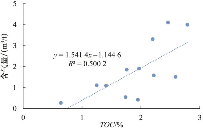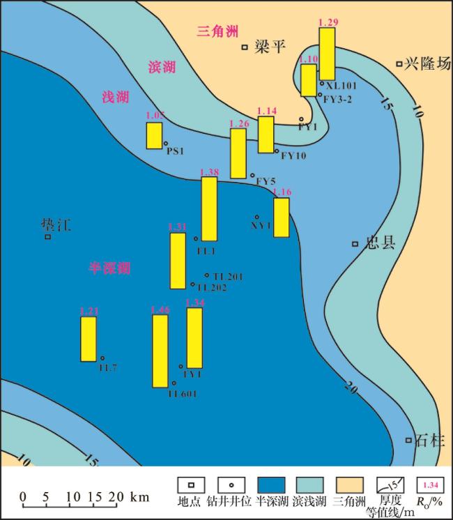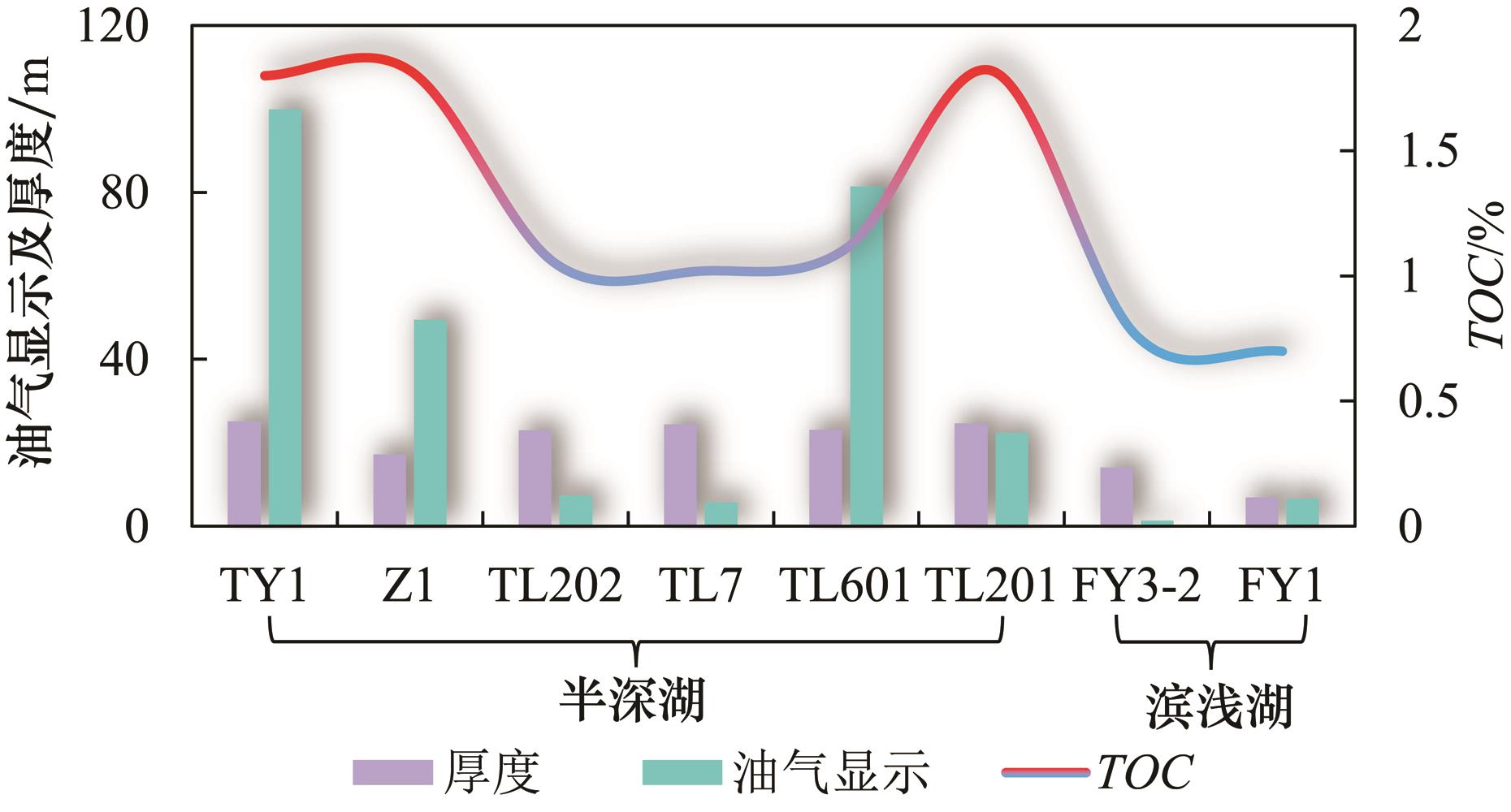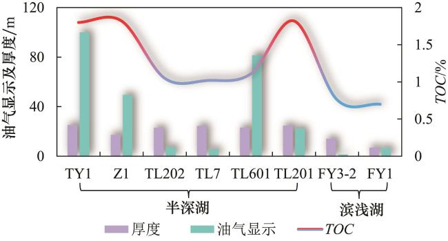 图5 不同相带页岩厚度、油气显示及TOC对比图Fig.5 Shale thickness, oil and gas display and TOC comparison diagram of different facies zones |