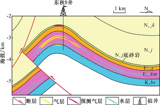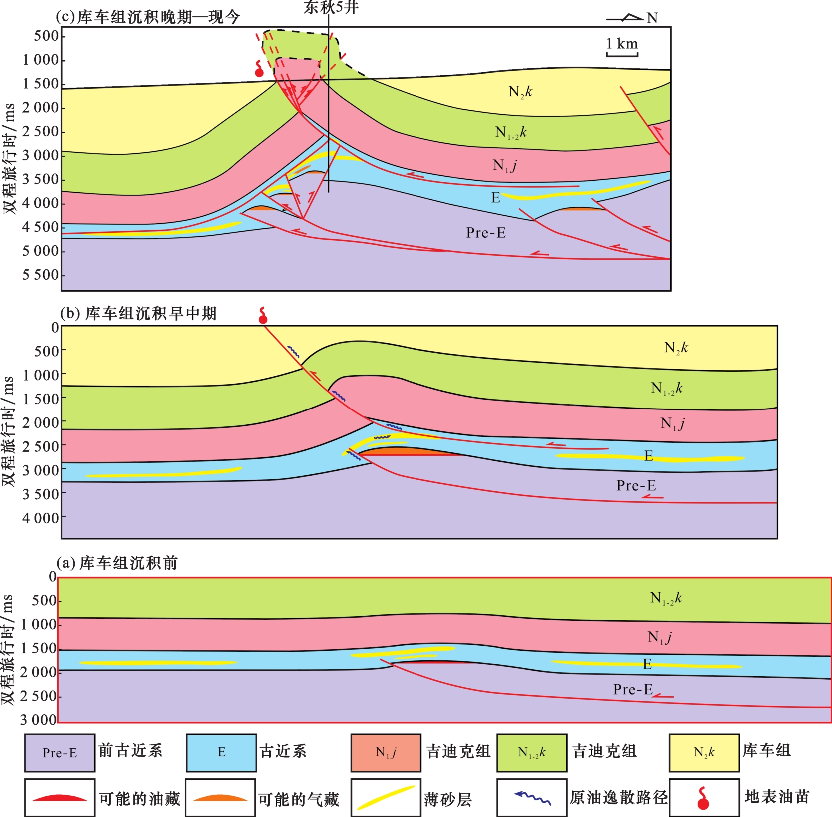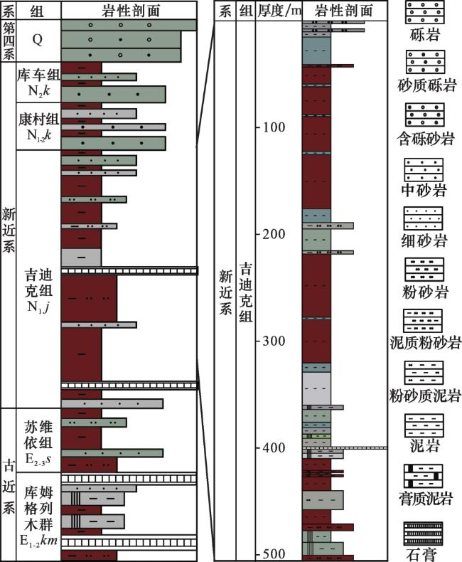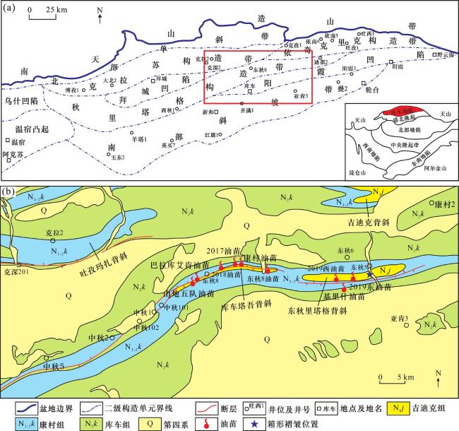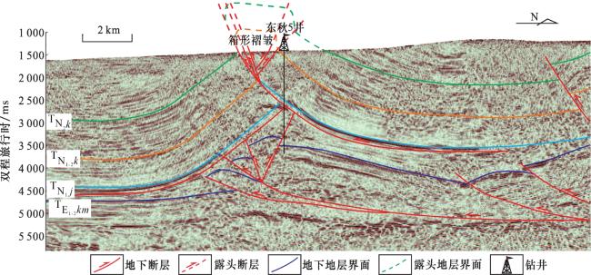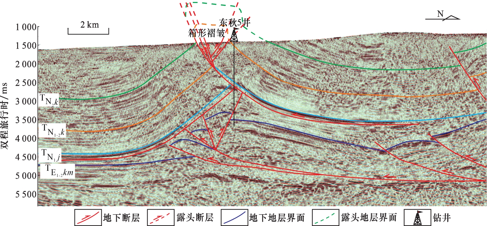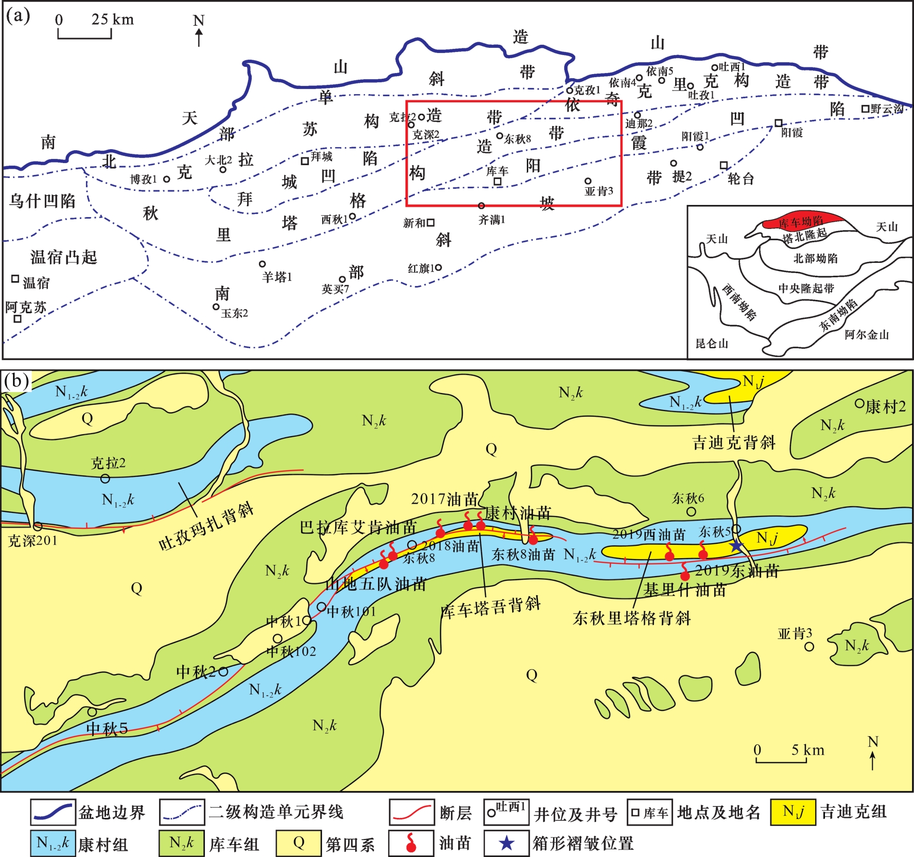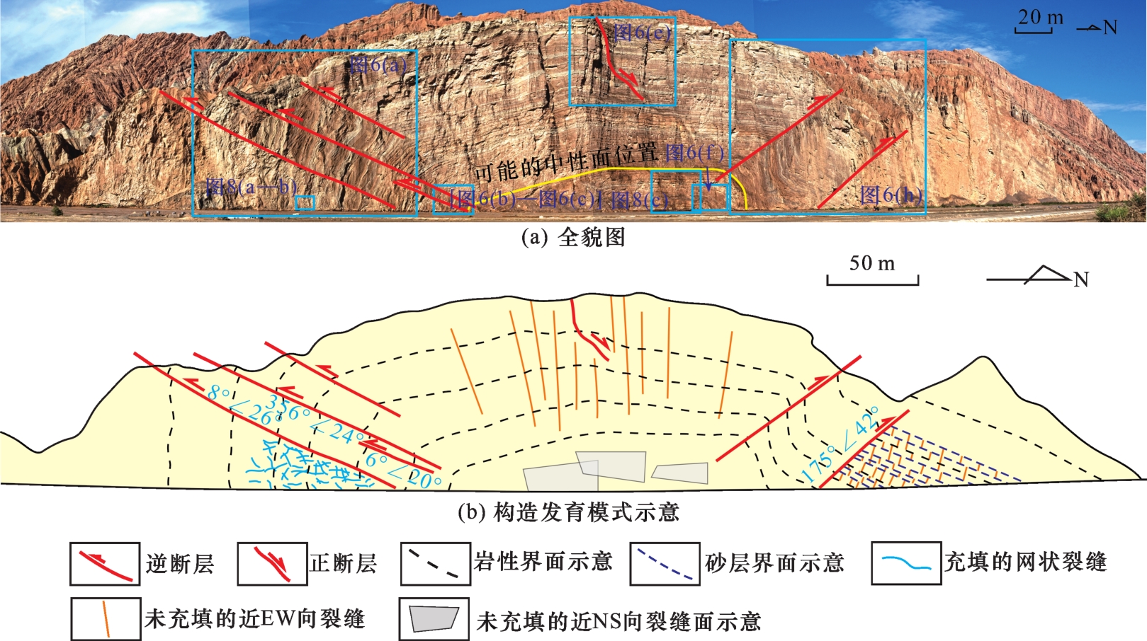 图2 库车坳陷秋里塔格构造带箱形褶皱全貌及构造发育模式示意Fig.2 Full view and schematic structural model of the box fold in the Qiulitage structural belt of Kuqa Depression |