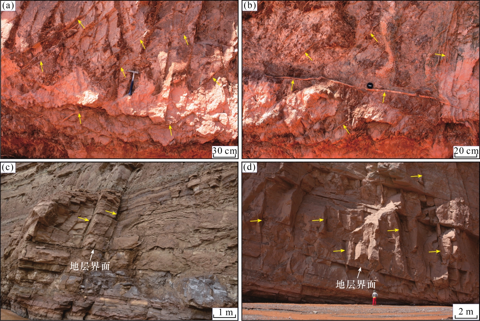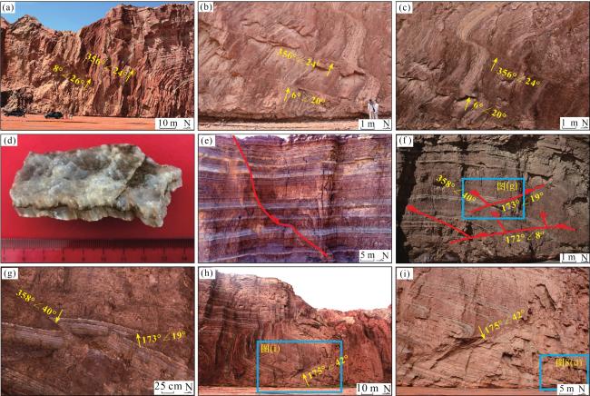 图8 库车坳陷秋里塔格构造带箱形褶皱中的裂缝特征(照片位置见图2及图6)(a)、(b)前翼网状裂缝系统,石膏完全充填;(c)核部直立裂缝,无充填;(d)北翼下部反冲断层下盘的直立—高角度裂缝,无充填 Fig.8 Fractures characteristic in the box fold in the Qiulitage structural belt of Kuqa Depression(see Figs.2 and 6 for photo locations) |