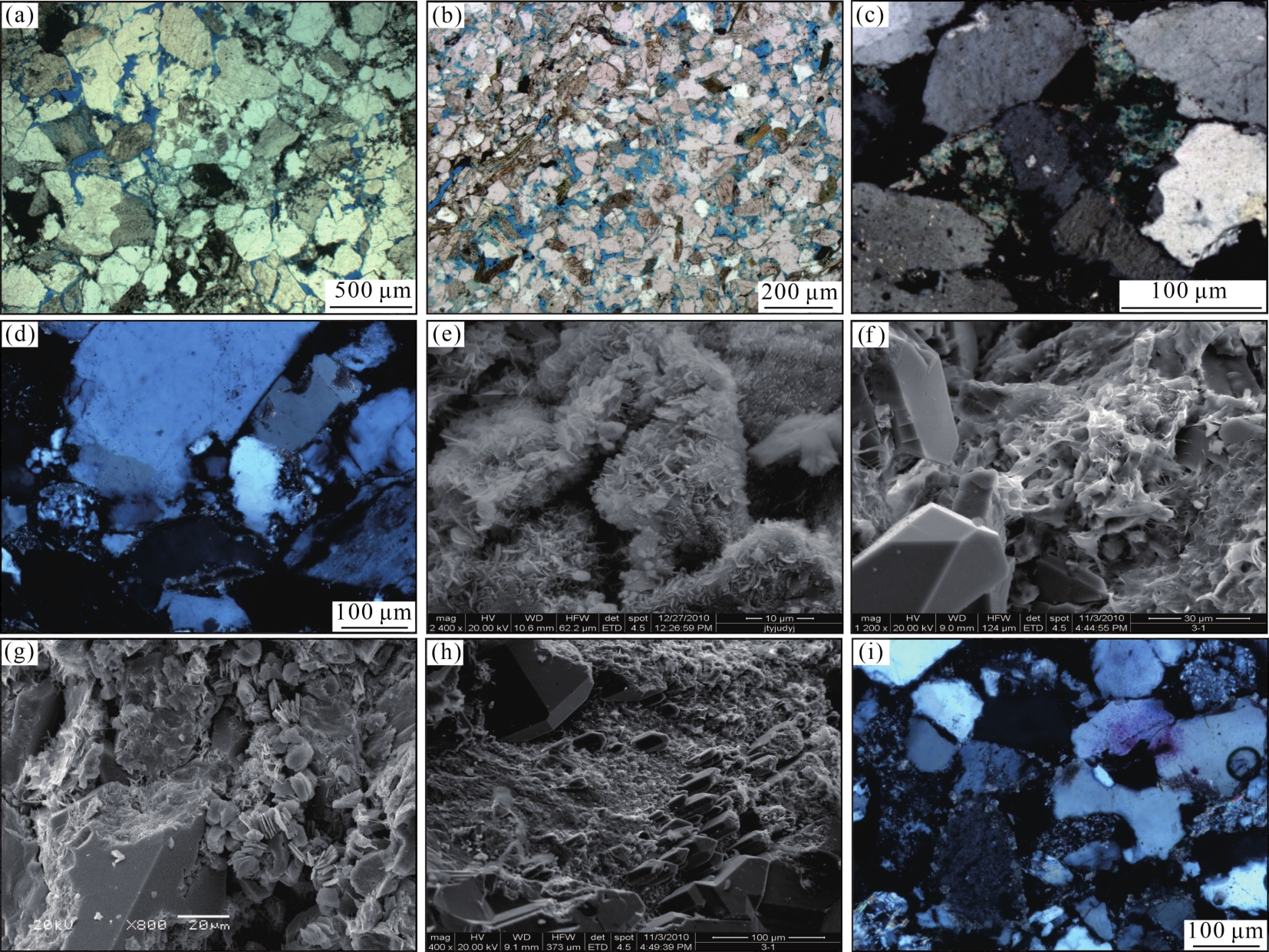 图4 琼东南盆地崖城地区陵水组、三亚组及梅山组储层微观成岩特征(a)刚性颗粒内部出现压裂缝,颗粒之间形成线—缝合式接触,YC13-1-3井,×25(单偏光),3 805.1 m,陵三段;(b)受压实作用而弯曲的云母,碎屑颗粒呈点—线接触,YC8-1-1井,×50(单偏光),3 311.9 m,陵水组三段; (c)粒间充填晚期白云石和铁白云石胶结物,YC13-1-A2 井,3 883.15 m,×50,陵三段; (d)菱铁矿交代长石,YC35-1-2井,4 861 m,×100(正交偏光),梅山组;(e)片状绿泥石生长在颗粒表面,占据粒间孔空间,YC13-1-A2井,3 920.6 m,SME,陵水组三段;(f)伊利石以发丝状堵塞喉道,YC13-1-A1井,3 694.5 m,SME,陵水组三段;(g)少量高岭石充填于粒间孔中,YC8-1-1 井,3 308.20 m,SME,陵水组;(h)自形晶石英生长于颗粒表面,YC13-1-A1 井,3 694.5 m,SME,陵水组;(i)白云石交代长石和石英颗粒,YC35-1-2井,4 861 m,×100(正交偏光),梅山组 Fig.4 The characteristics of diagenesis under microscope of reservoir from Lingshui Formation, Sanya Formation and Meishan Formation of Yacheng area in Qiongdongnan Basin |