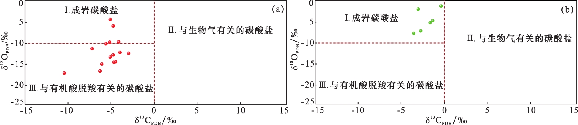 | 样品编号 | 深度/m | 层位 | δ13C/‰(PDB) | δ18O/‰(PDB) | Z值 | T/℃ |