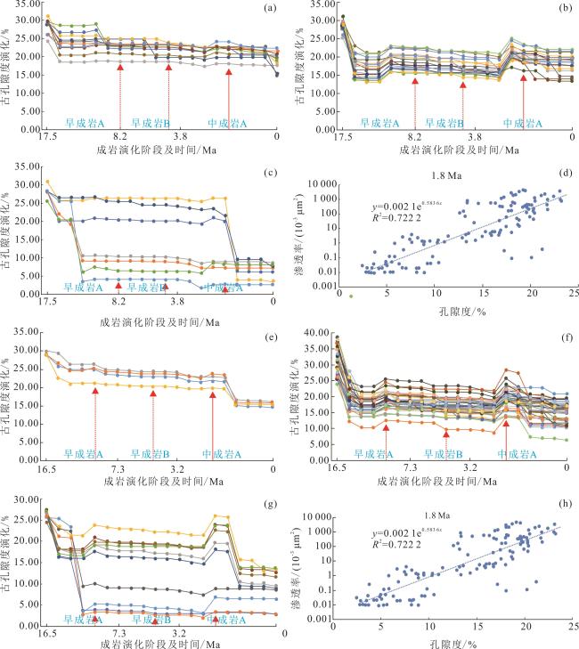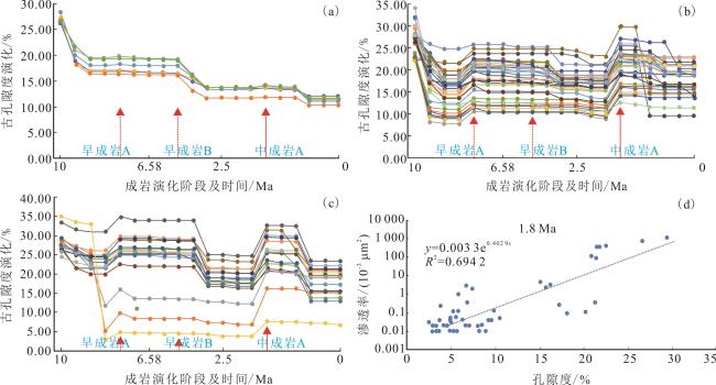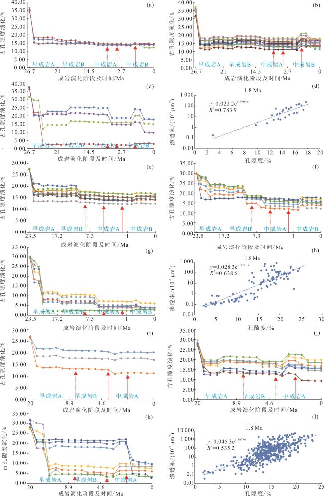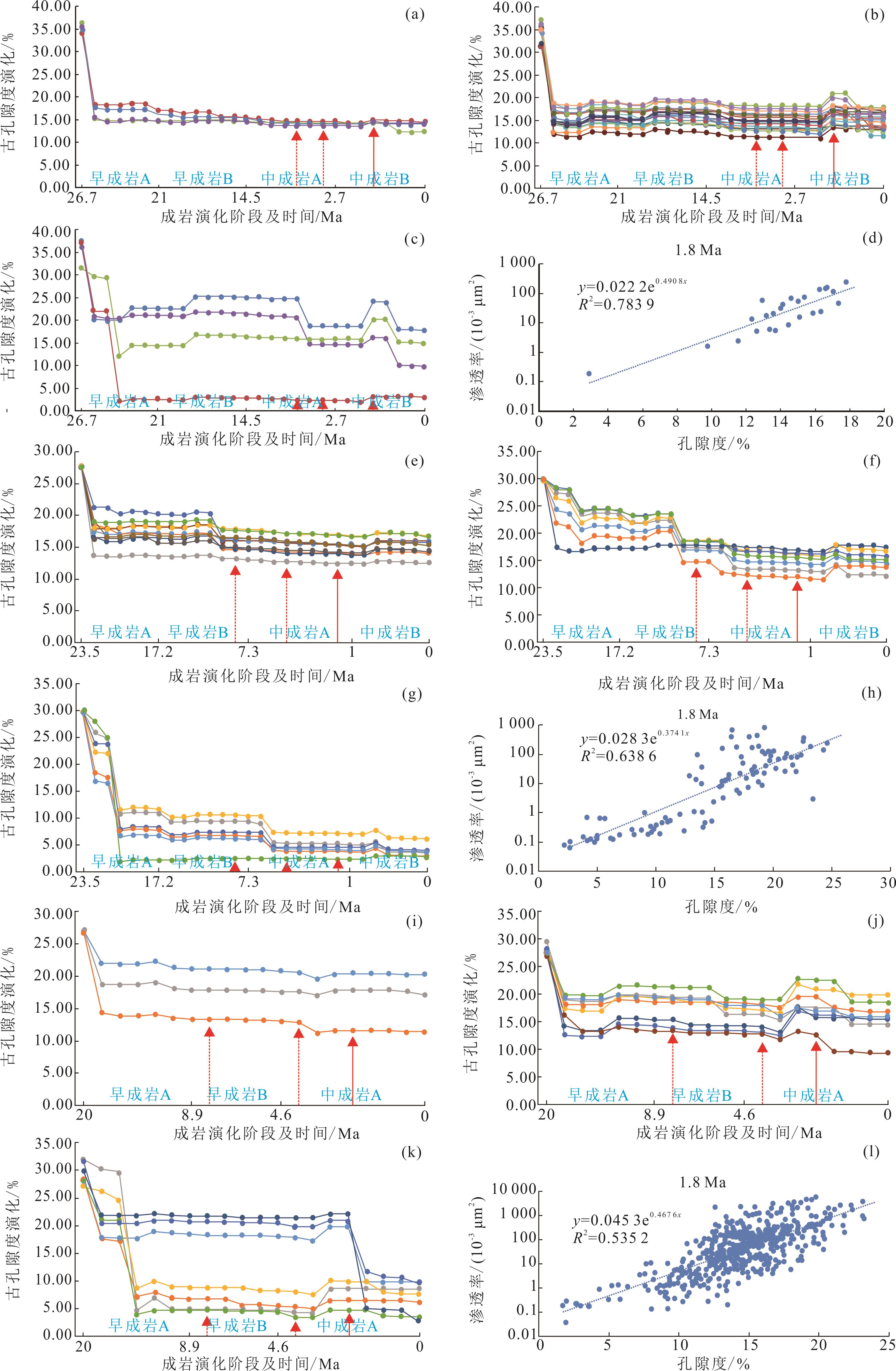 | 古孔隙度/% | (16.4~19.78)/17.97 | (4.8~34.97)/24.13 | (10.5~25.73)/18.18 | (16.16~19.21)/17.54 | (4.53~33.97)/(23.49) | (10.3~25.23)/17.67 | (11.86~14.16)/13.55 | (7.58~32.62)/24.29 | (12.45~29.7)/(21.02) |