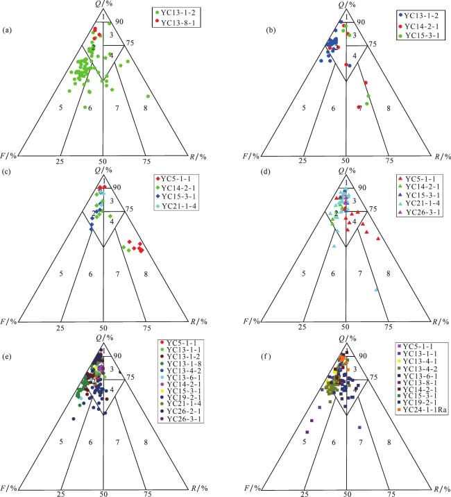图2 琼东南盆地崖城地区陵水组、三亚组及梅山组砂岩组分三角图1.石英砂岩;2.长石质石英砂岩;3.岩屑质石英砂岩;4.长石岩屑质石英砂岩;5.长石砂岩;6.岩屑质长石砂岩;7.长石质岩屑砂岩;8.岩屑砂岩(a)陵水组三段;(b)陵水组二段;(c)陵水组一段;(d)三亚组二段;(e)三亚组一段;(f)梅山组 Fig.2 Components of sandstone triangle diagram from Lingshui Formation, Sanya Formation and Meishan Formation of Yacheng area in Qiongdongnan Basin |