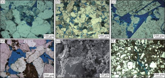 图3 琼东南盆地崖城地区陵水组、三亚组及梅山组储层孔隙类型及特征(a)粒间溶孔和粒内溶孔为主,局部发育剩余原生粒间孔,YC19-1-1井,陵水组三段,4 680.05 m,铸体薄片,×100,(-);(b)易溶矿物颗粒边缘遭受溶蚀,形成粒间溶孔,YC19-1-1井,陵水组三段,4 673.19 m,铸体薄片,×50,(-);(c)长石颗粒沿解理缝发生溶蚀,形成蜂窝状粒内溶孔,YC19-2-1井,陵水组三段,3 827.9 m,铸体薄片,×100,(-);(d)铸模孔与粒间孔连通起来形成的超大孔,YC13-1-A1井,陵水组三段,3 706.09 m,铸体薄片,×50,(-);(e)高岭石矿物晶间孔,YC8-1-1井,陵水组,3 308.2 m,SEM,×2 000;(f)裂缝型孔隙,YC19-2-1井,梅山组,3 793.1 m,铸体薄片,×100,(-) Fig.3 The types and characteristics of pore in the sandstone reservoir from Lingshui Formation, Sanya Formation and Meishan Formation of Yacheng area in Qiongdongnan Basin |