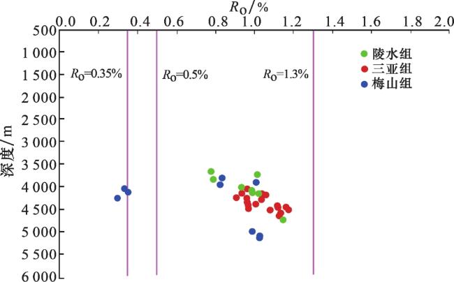 表1 琼东南盆地崖城地区陵水组和梅山组碳酸盐胶结物碳氧同位素分析结果Table 1 Carbon and oxygen isotope of carbonate cement from Lingshui Formation and Meishan Formation of Yacheng area in Qiongdongnan Basin |