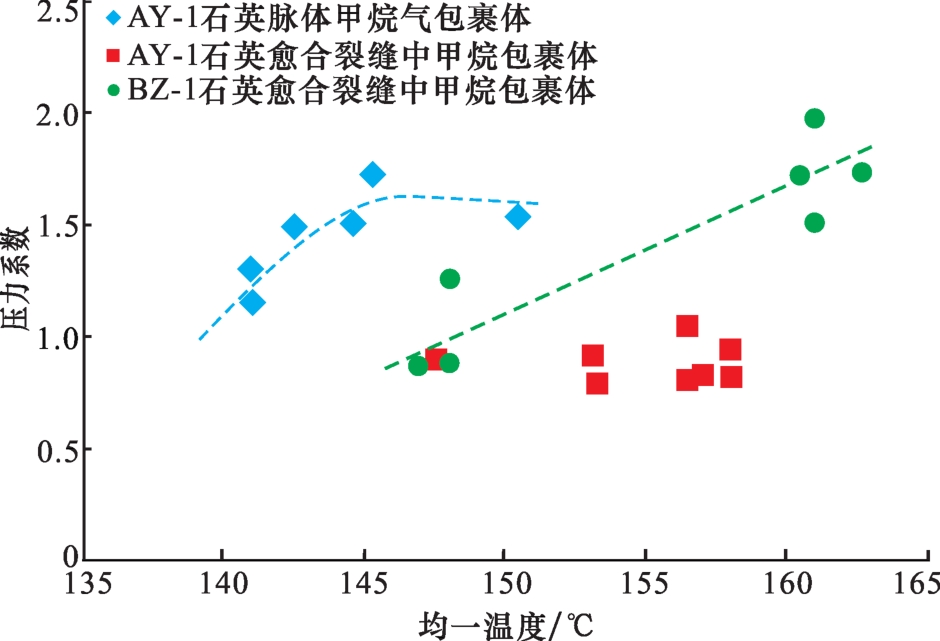 | 赋存位置 | 样品编号 | 深度/m | 层位 | V means/cm-1 | V corr/cm-1 | D/cm-1 | ρ /(g/cm3) | 伴生盐水均一温度/℃ | 捕获压力 /MPa | 压力系数 |