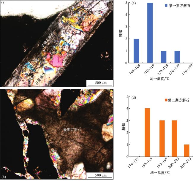图4 黔北地区龙马溪组页岩脉体成岩照片[(a),(b)]及方解石脉体盐水包裹体均一温度分布直方图[(c),(d)](a)AY1-7,2 328.55 m,第一期方解石,第二期石英,正交偏光;(b)BZ1-29,1 104.5 m,第一期石英和第二期方解石,正交偏光;(c)AY1井中方解石脉体内盐水包裹体均一温度分布直方图;(d)BZ1井中方解石脉体内盐水包裹体均一温度分布直方图 Fig.4 Diagenesis photos of shale-vein((a),(b)) and homogenization temperature distribution histograms((c),(d)) of brine inclusions in calcite veins in Longmaxi Formation in northern Guizhou |