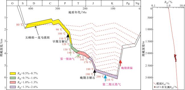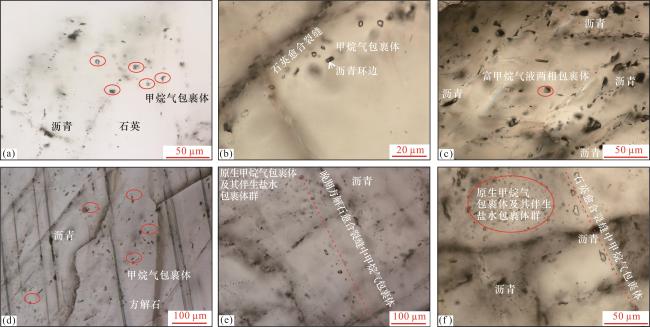 图5 黔北地区五峰组—龙马溪组页岩脉体流体包裹体照片(a)AY1-7,2 328.55 m,S1 l,石英中散乱分布甲烷气包裹体及少量沥青,单偏光;(b)AY1-7,2 328.55 m,S1 l,石英内部愈合裂缝中甲烷气包裹体及其伴生盐水包裹体,部分甲烷包裹体可见沥青环边,单偏光;(c)AY1-5,2 329.6 m,O3 w,石英中单独分布的长方形富甲烷气液两相包裹体及愈合裂缝中分布的甲烷气及其伴生盐水包裹体,大量散乱分布沥青,单偏光;(d)BZ1-29,1 104.5 m,S1 l,方解石中零散分布甲烷气包裹体,裂缝中可见沥青,单偏光;(e)BZ1-29,1 104.5 m,S1 l,方解石中散乱分布的甲烷气包裹体及其伴生盐水包裹体群及晚期愈合裂缝中甲烷气包裹体,可见沥青,单偏光;(f)BZ1-29,1 104.5 m,S1 l,石英中散乱分布的甲烷气包裹体及其伴生盐水包裹体群及晚期愈合裂缝中甲烷气包裹体,可见沥青,单偏光 Fig.5 Photos of fluid inclusions in shale veins in Wufeng-Longmaxi formations in northern Guizhou |