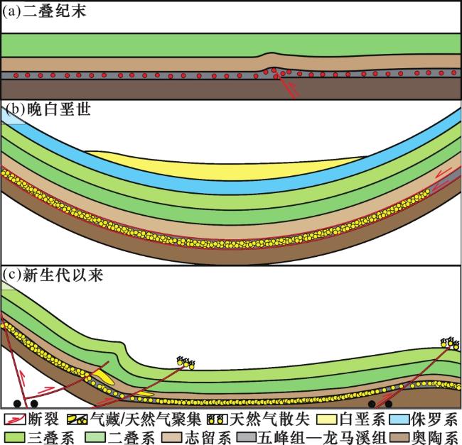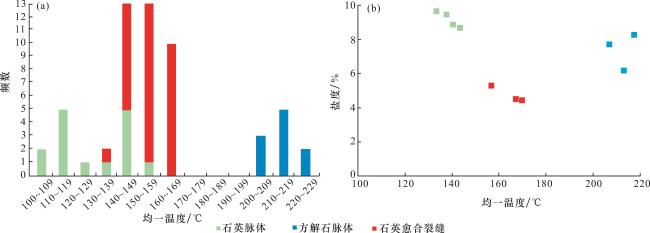 图6 黔北地区龙马溪组页岩脉体中甲烷气包裹体的伴生盐水包裹体均一温度分布直方图(a)和盐度与均一温度分布散点图(b)Fig.6 Histogram of homogenization temperature distribution(a) and scatter plots of salinity and homogenization temperature of associated brine inclusions of methane gas inclusions(b) in shale veins of Longmaxi Formation in northern Guizhou |