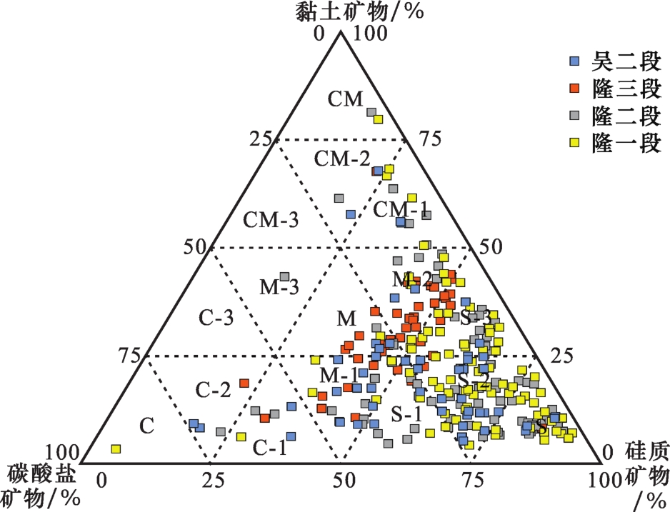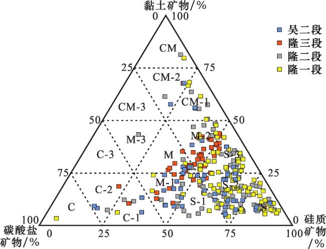 图4 吴家坪组二段和大隆组页岩岩相类型矿物组分三端元图S:硅质页岩相;S-1:含灰硅质页岩相;S-2:混合硅质页岩相;S-3:含黏土硅质页岩相;C:灰质页岩相;C-1:含硅灰质页岩相;C-2:混合灰质页岩相;C-3:含黏土灰质页岩相;M:混合质页岩相;M-1:含灰/硅混合质页岩相;M-2:含黏土/硅混合质页岩相;M-3:含黏土/灰混合质页岩相;CM:黏土质页岩相;CM-1:含硅黏土质页岩相;CM-2:混合黏土质页岩相;CM-3:含灰黏土质页岩相;分类方法基于文献[37] Fig.4 Three terminal element diagram of shale lithofacies types based on mineral components for the second member of Wujiaping Formation and Dalong Formation |