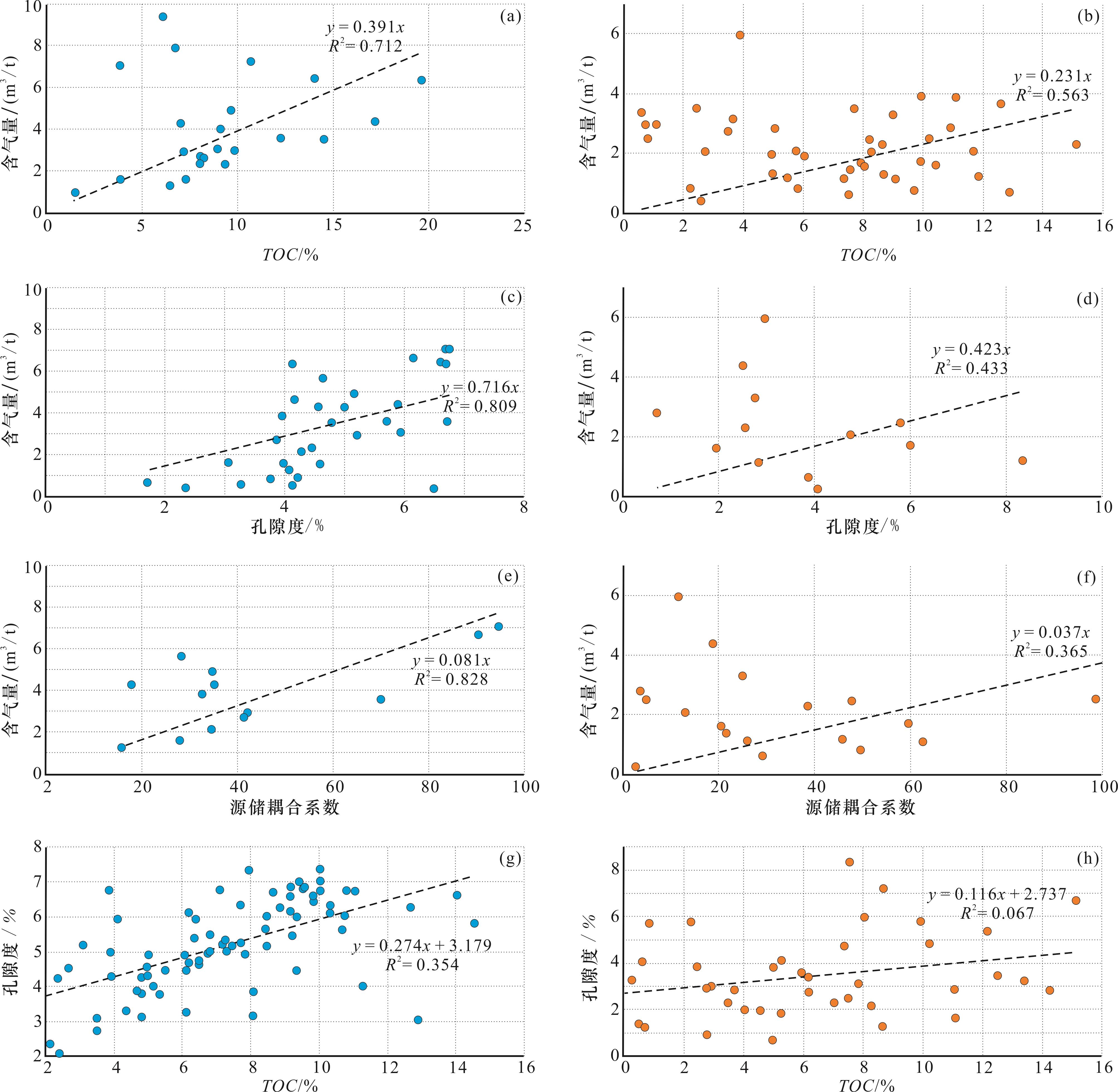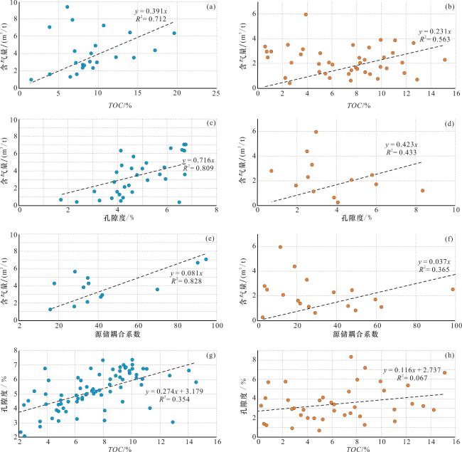图8 鄂西地区吴家坪组二段和大隆组页岩气富集参数相关性(a)TOC与含气量相关性,吴家坪组二段;(b)TOC与含气量相关性,大隆组;(c)孔隙度与含气量相关性,吴家坪组二段;(d)孔隙度与含气量相关性,大隆组;(e)“源—储耦合”系数与含气量相关性,吴家坪组二段;(f)“源—储耦合”系数与含气量相关性,大隆组;(g)TOC与孔隙度相关性,吴家坪组二段;(h)TOC与孔隙度相关性,大隆组 Fig.8 Correlation between shale gas enrichment parameters of the second member of the Wujiaping Formation and Dalong Formation in western Hubei area |