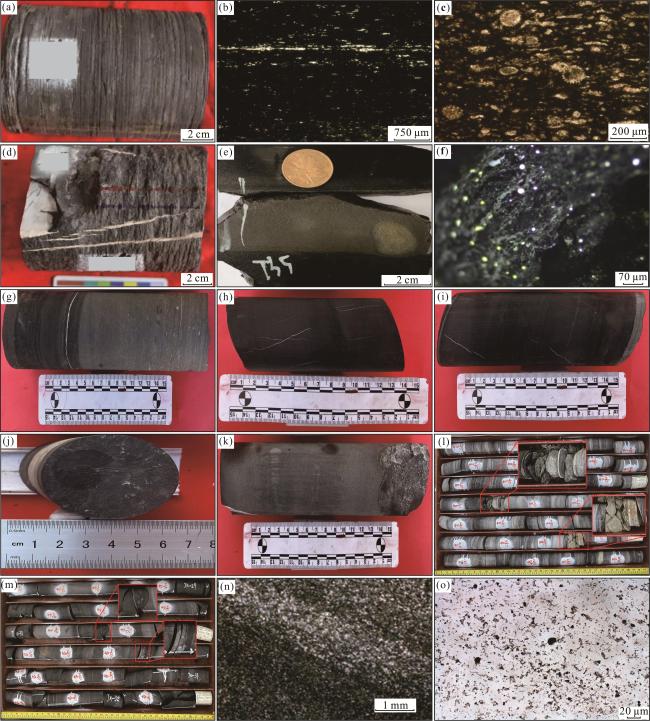 图3 鄂西地区吴家坪组二段和大隆组页岩岩心、薄片和干酪根照片(a)黑灰色碳硅质页岩,吴家坪组二段,HY1井,3 305.5~3 305.6 m;(b)碳硅质页岩发育弱水平层理,吴家坪组二段,HY1井;(c)碳硅质页岩中见大量放射虫化石,吴家坪组二段,HY1井;(d)泥质灰岩夹层发育高角度缝,充填方解石,吴家坪组二段,HY1井,3 308.2 m;(e)黄绿色凝灰岩夹层,厚2 cm左右,吴家坪组二段,HY1井,3 309.2 m;(f)碳硅质页岩干酪根以藻类和沥青体为主,吴家坪组二段,HY1井;(g)黑色碳硅质页岩与灰黑色含泥灰岩互层,大隆组三段,EED2井,1 213.20~1 213.45 m;(h)黑色碳硅质页岩发育层理缝和高角度缝,大隆组二段,EED2井,1 234.10~1 234.24 m;(i)黑色碳硅质页岩发育层理缝和高角度缝,左端夹厚2 mm凝灰岩,右端为厚5 cm灰色含泥灰岩,大隆组一段,EED2井,1 243.50~1 243.70 m;(j)页岩截面中见菊石化石,大隆组三段,EED2井,1 192.3 m;(k)含生屑泥晶灰岩夹层,厚20 cm以上,大隆组一段,EED2井,1 235.82~1 236.05 m;(l)大隆组顶部泥岩与灰岩互层段,夹厚10~15 cm凝灰岩(局部放大),大隆组三段,EED2井,1 185.2~1 192.2 m;(m)大隆组碳硅质页岩中夹泥质灰岩与薄层凝灰岩(局部放大),大隆组一段,EED2井,1 242.2~1 248.2 m;(n)碳硅质页岩发育水平层理,大隆组一段,EED2井;(o)碳硅质页岩干酪根以腐泥无定形体为主,大隆组一段,EED2井 Fig.3 Photographs of shales core, flakes and kerogen of the second member of Wujiaping Formation and Dalong Formation in western Hubei area |