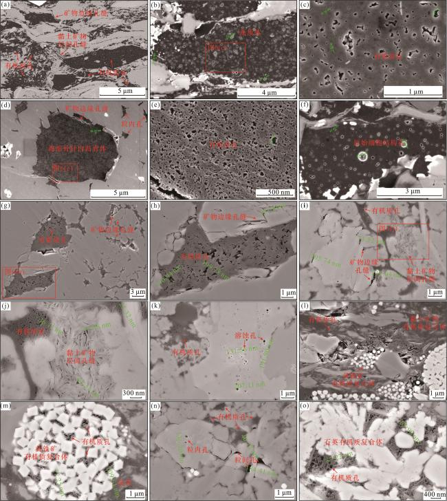 图6 鄂西地区吴家坪组二段和大隆组扫描电镜下孔隙微观形态(a)有机质孔与多种无机质孔共同发育,吴家坪组二段,HY1井,3 304.4 m;(b)藻质体干酪根内发育有机质孔,吴家坪组二段,HY1井,3 303.5 m;(c)图(b)局部放大,有机质孔呈不规则状,吴家坪组二段,HY1井,3 303.5 m;(d)海绵骨针化石内充填沥青体,内部发育大量有机质孔,吴家坪组二段,HY1井,3 294.1 m;(e)图(d)局部放大,有机质孔密集发育,面孔率达10%以上,吴家坪组二段,HY1井,3 294.1 m;(f)原始细胞结构构成的干酪根内发育大量有机质孔,圆度较高,吴家坪组二段,HY1井,3 294.1 m;(g)矿物颗粒边缘孔缝及其内部充填的有机质,大隆组二段,EED2井,1 237.2 m;(h)图(g)局部放大,有机质内发育不规则形状有机质孔,大隆组二段,EED2井,1 237.2 m;(i)矿物边缘孔缝及其充填的有机质,可见黏土矿物层间孔缝,大隆组一段,EED2井,1 244.2 m;(j)图(i)局部放大,可见有机质孔和黏土矿物层间孔缝,大隆组一段,EED2井,1 244.2 m;(k)无机矿物内发育溶蚀孔,边缘充填有机质,内部发育有机质孔,大隆组一段,EED2井,1 244.2 m;(l)有机质与黏土矿物和黄铁矿形成复合体,内部发育有机质孔,大隆组一段,EED2井,1 253.0 m;(m)有机质与黄铁矿形成的复合体内发育大量有机质孔,大隆组一段,EED2井,1 249.2 m;(n)无机矿物内部和颗粒间发育大量孔缝,有机质填隙在边缘,大隆组二段,EED2井,1 229.6 m;(o)有机质与石英形成复合体,内部发育大量孔隙,大隆组二段,EED2井,1 234.2 m Fig.6 Micro morphology of pores under scanning electron microscope for the second member of Wujiaping Formation and Dalong Formation in western Hubei area |