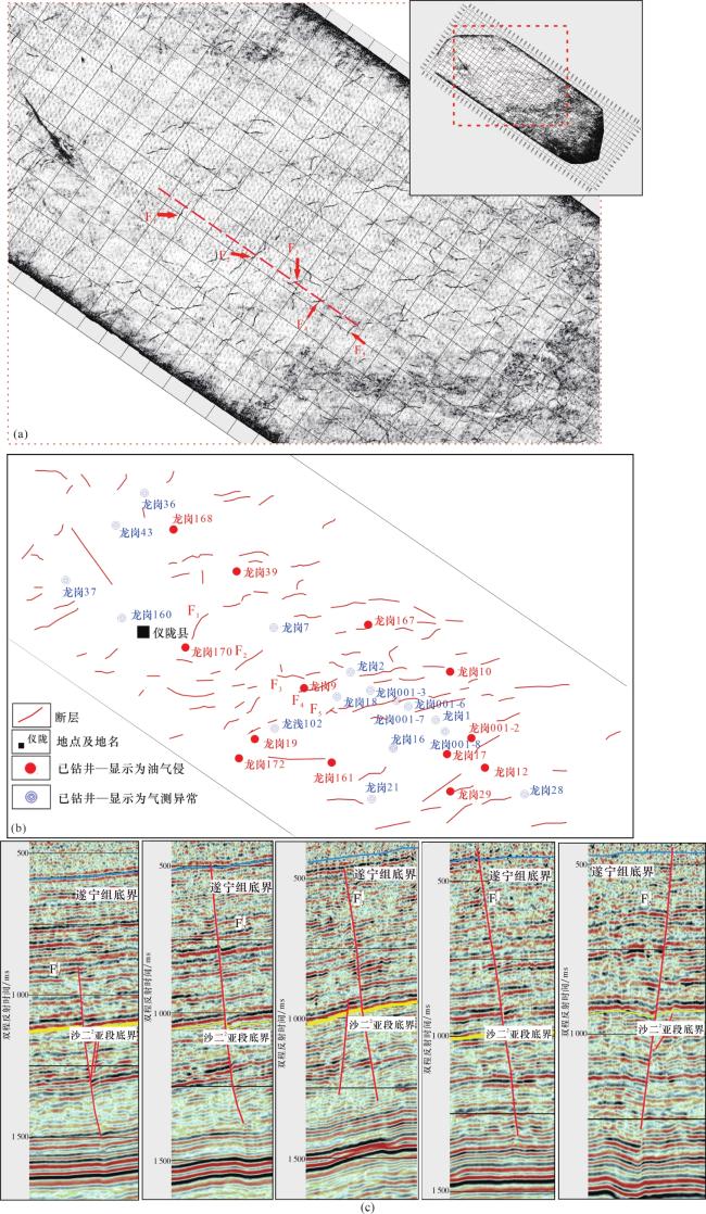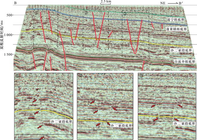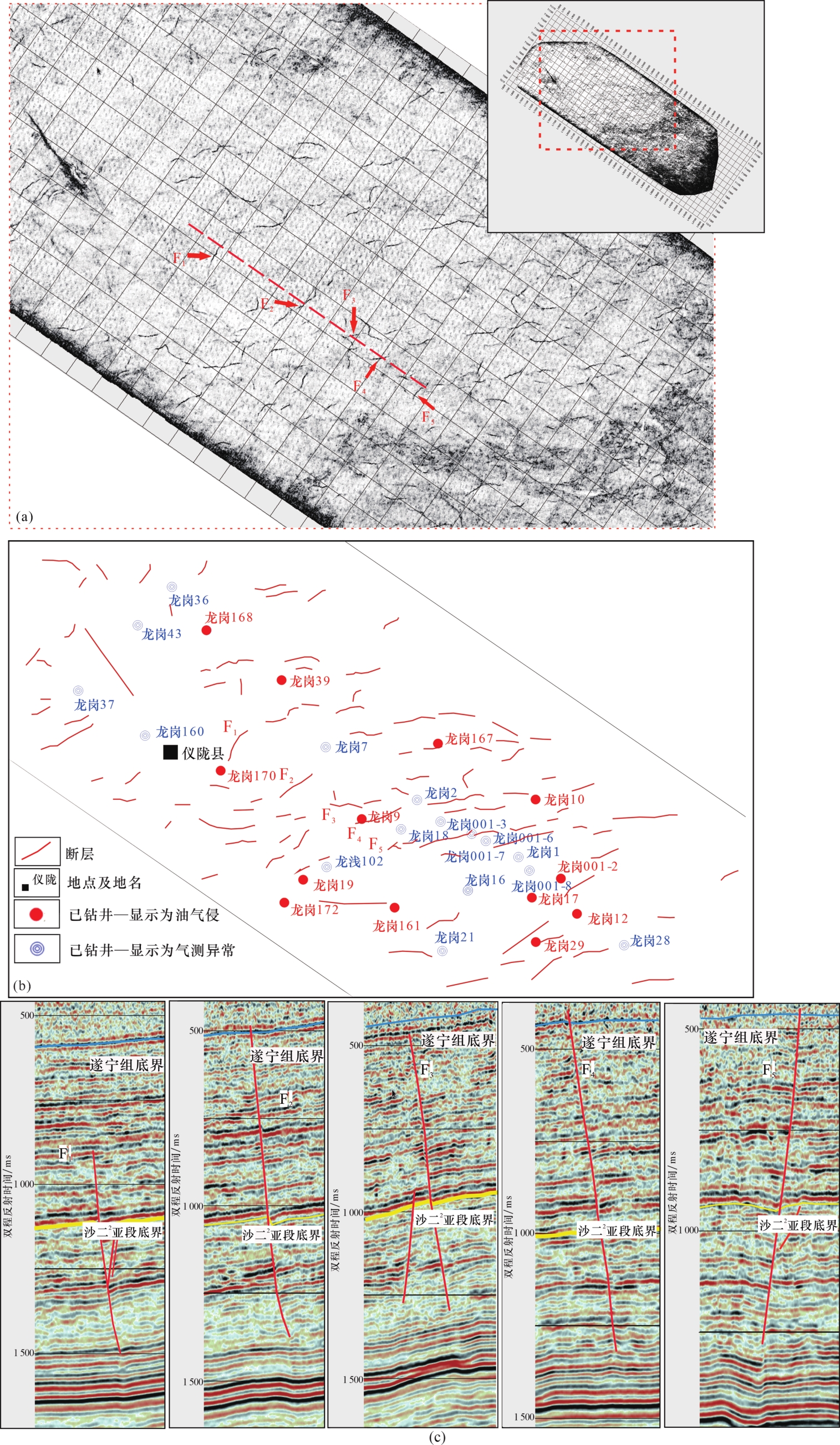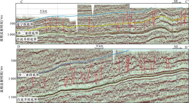图4 龙岗地区NE向三维测线断层解释结果Fig.4 Interpretation result of NE direction 3D seismic section in Longgang area |
